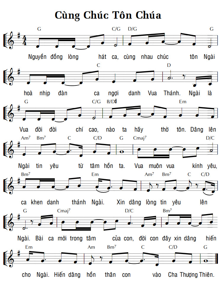 1. Nguyện đồng lòng hát ca, cùng nhau chúc tôn Ngài hoà nhịp đàn ca ngợi danh Vua Thánh. Ngài là Vua đời đời chí cao, nào ta hãy thờ tôn. Dâng lên Ngài tin yêu từ tâm hồn ta. Vua muôn vua kính yêu, ca khen danh thánh Ngài. Xin dâng lòng tin yêu lên Ngài. Bài ca mới trong tâm của con, đời con đây xin dâng hiến cho Ngài. Hiến dâng hồn thân con vào Cha Thượng Thiên.