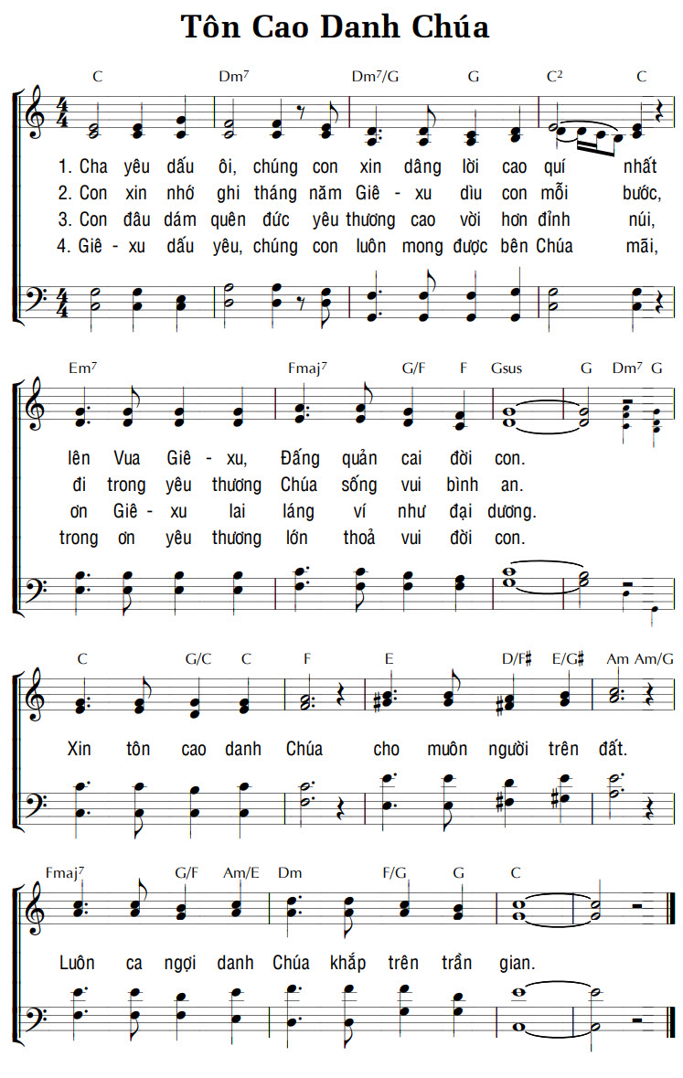 1. Cha yêu dấu ôi, chúng con xin dâng lời cao quí nhất lên Vua Giê-xu, Đấng quản cai đời con. 2. Con xin nhớ ghi tháng năm Giê-xu dìu con mỗi bước, đi trong yêu thương Chúa sống vui bình an. 3. Con đâu dám quên đức yêu thương cao vời hơn đỉnh núi, ơn Giê-xu lai láng ví như đại dương. 4. Giê-xu dấu yêu, chúng con luôn mong được bên Chúa mãi, trong ơn yêu thương lớn thoả vui đời con. Điệp khúc: Xin tôn cao danh Chúa cho muôn người trên đất. Luôn ca ngợi danh Chúa khắp trên trần gian.
