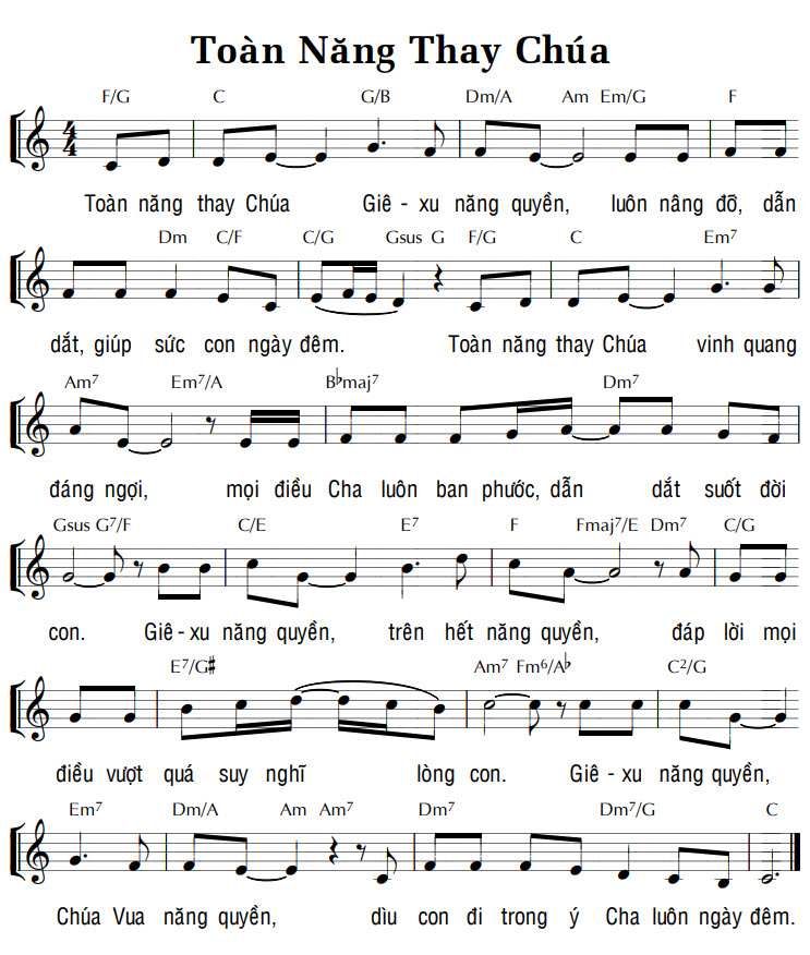 1. Toàn năng thay Chúa Giê-xu năng quyền, luôn nâng đỡ, dẫn dắt, giúp sức con ngày đêm. Toàn năng thay Chúa vinh quang đáng ngợi, mọi điều Cha luôn ban phước, dẫn dắt suốt đời con. Giê-xu năng quyền, trên hết năng quyền, đáp lời mọi điều vượt quá suy nghĩ lòng con. Giê-xu năng quyền, Chúa Vua năng quyền, dìu con đi trong ý Cha luôn ngày đêm.