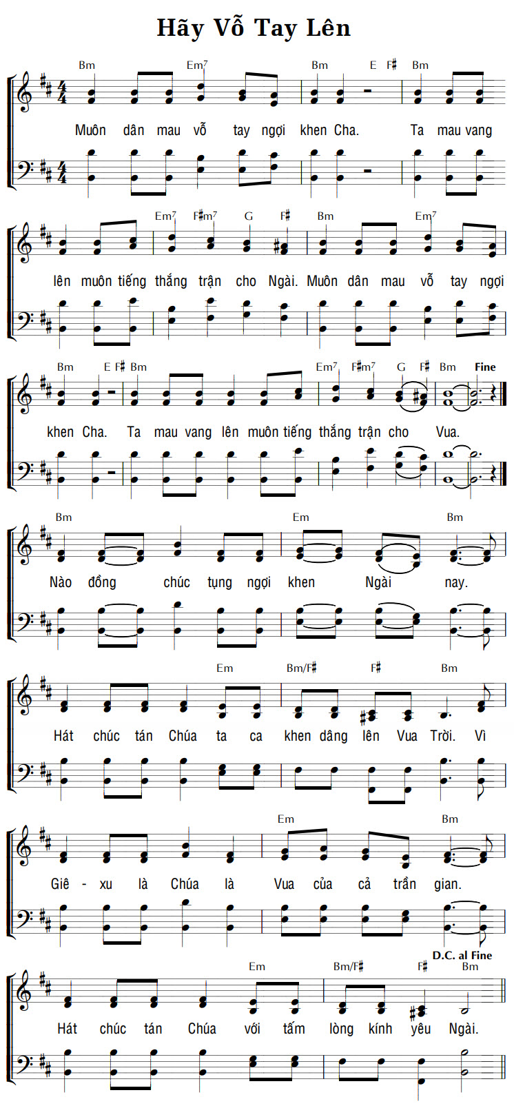 1. Muôn dân mau vỗ tay ngợi khen Cha. Ta mau vang lên muôn tiếng thắng trận cho Ngài. Muôn dân mau vỗ tay ngợi khen Cha. Ta mau vang lên muôn tiếng thắng trận cho Vua. 2. Nào đồng chúc tụng ngợi khen Ngài nay. Hát chúc tán Chúa ta ca khen dâng lên Vua Trời. Vì Giê-xu là Chúa là Vua của cả trần gian. 3. Hát chúc tán Chúa với tấm lòng kính yêu Ngài.