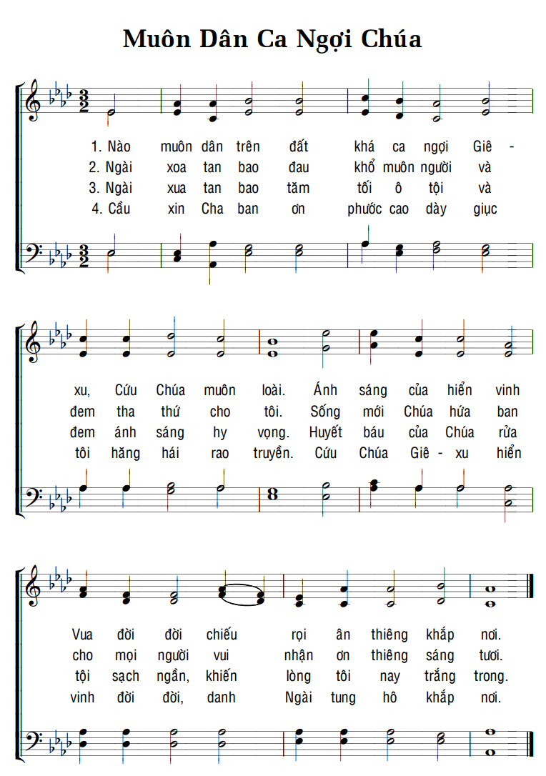 1. Nào muôn dân trên đất khá ca ngợi Giê-xu, Cứu Chúa muôn loài. Ánh sáng của hiển vinh Vua đời đời chiếu rọi ân thiêng khắp nơi. 2. Ngài xoa tan bao đau khổ muôn người và đem tha thứ cho tôi. Sống mới Chúa hứa ban cho mọi người vui nhận ơn thiêng sáng tươi. 3. Ngài xua tan bao tăm tối ô tội và đem ánh sáng hy vọng. Huyết báu của Chúa rửa tội sạch ngần, khiến lòng tôi nay trắng trong. 4. Cầu xin Cha ban ơn phước cao dày giục tôi hăng hăng hái rao truyền. Cứu Chúa Giê-xu hiển vinh đời đời, danh Ngài tung hô khắp nơi.