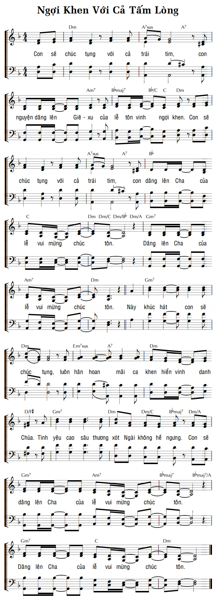 Điệp khúc: Con sẽ chúc tụng với cả trái tim, con nguyện dâng lên Giê-xu của lễ tôn vinh ngợi khen. Con sẽ chúc tụng với cả trái tim, con dâng lên Cha của lễ vui mừng chúc tôn. Dâng lên Cha của lễ vui mừng chúc tôn. Này khúc hát con sẽ chúc tụng, luôn hân hoan mãi ca khen hiển vinh danh Chúa. Tình yêu cao sâu thương xót Ngài không hề ngưng. Con sẽ dâng lên Cha của lễ vui mừng chúc tôn. Dâng lên Cha của lễ vui mừng chúc tôn.