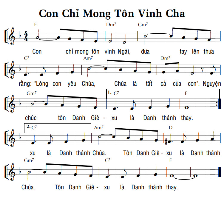 1. Con chỉ mong tôn vinh Ngài, đưa tay lên thưa rằng: "Lòng con yêu Chúa, Chúa là tất cả của con". Nguyện chúc tôn Danh Giê-xu là Danh thánh thay. 2. Con chỉ mong tôn vinh Ngài, đưa tay lên thưa rằng: "Lòng con yêu Chúa, Chúa là tất cả của con". Nguyện chúc tôn Danh Giê-xu là Danh thánh Chúa. Tôn Danh Giê-xu là Danh thánh Chúa. Tôn Danh Giê-xu là Danh thánh thay.