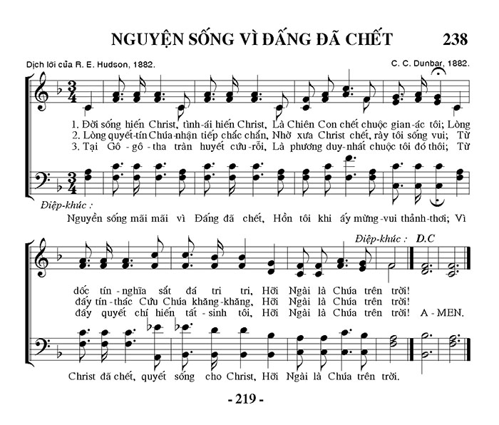 1. Đời sống hiến Christ, tình ái hiến Christ, Là Chiên Con chết chuộc gian ác tôi; Lòng dốc tín - nghĩa sắt đá tri tri, Hỡi Ngài là Chúa trên trời! 2. Lòng quyết tín Chúa nhận tiếp chắc chắn, Nhờ xưa Christ chết, rày tôi sống vui; Từ đẩy tín - thác Cứu Chúa khăng khăng, Hỡi Ngài là Chúa trên trời! 3. Tại Gô-gô - tha tràn huyết cứu rỗi, Là phương duy nhất chuộc tôi đó thôi; Từ đấy quyết chí hiến tất - sinh tôi, Hỡi Ngài là Chúa trên trời! A - MEN. outro. Christ đã chết, quyết sống cho Christ, Hỡi Ngài là Chúa trên trời. Điệp khúc: Nguyền sống mãi mãi vì Đấng đã chết, Hồn tôi khi ấy mừng vui thảnh thơi; Vì