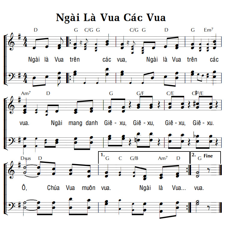 1. Ngài là Vua trên các vua, Ngài là Vua trên các vua. Ngài mang danh Giê-xu, Giê-xu, Giê-xu, Giê-xu. Ô, Chúa Vua muôn vua. Ngài là Vua... vua.