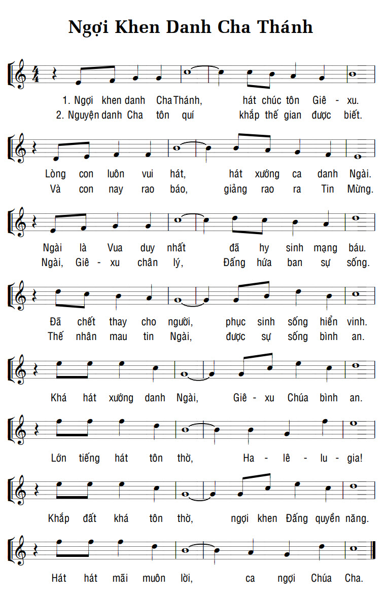 1. Ngợi khen danh Cha Thánh, hát chúc tôn Giê-xu. Lòng con luôn vui hát, hát xướng ca danh Ngài. Ngài là Vua duy nhất đã hy sinh mạng báu. Đã chết thay cho người, phục sinh sống hiển vinh. Khá hát xướng danh Ngài, Giê-xu Chúa bình an. Lớn tiếng hát tôn thờ, Ha-lê-lu-gia! Khắp đất khá tôn thờ, ngợi khen Đấng quyền năng. Hát hát mãi muôn lời, ca ngợi Chúa Cha. 2. Nguyện danh Cha tôn quí khắp thế gian được biết. Và con nay rao báo, giảng rao ra Tin Mừng. Ngài, Giê-xu chân lý, Đấng hứa ban sự sống. Thế nhân mau tin Ngài, được sự sống bình an. Khá hát xướng danh Ngài, Giê-xu Chúa bình an. Lớn tiếng hát tôn thờ, Ha-lê-lu-gia! Khắp đất khá tôn thờ, ngợi khen Đấng quyền năng. Hát hát mãi muôn lời, ca ngợi Chúa Cha.