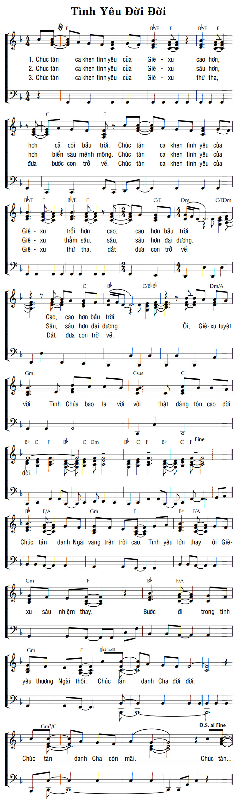 1. Chúc tán ca khen tình yêu của Giê-xu cao hơn, hơn cả cõi bầu trời. Chúc tán ca khen tình yêu của Giê-xu trổi hơn, cao, cao hơn bầu trời. Cao, cao hơn bầu trời. 2. Chúc tán ca khen tình yêu của Giê-xu sâu hơn, hơn biển sâu mênh mông. Chúc tán ca khen tình yêu của Giê-xu thẳm sâu, sâu, sâu hơn đại dương. Sâu, sâu hơn đại dương. 3. Chúc tán ca khen tình yêu của Giê-xu thứ tha, đưa bước con trở về. Chúc tán ca khen tình yêu của Giê-xu thứ tha, dắt đưa con trở về. Dắt đưa con trở về. Điệp khúc: Ôi, Giê-xu tuyệt vời. Tình Chúa bao la vời vời thật đáng tôn cao đời đời. Chúc tán danh Ngài vang trên trời cao. Tình yêu lớn thay ôi Giê-xu sâu nhiệm thay. Bước đi trong tình yêu thương Ngài thôi. Chúc tán danh Cha đời đời. Chúc tán danh Cha còn mãi. Chúc tán...