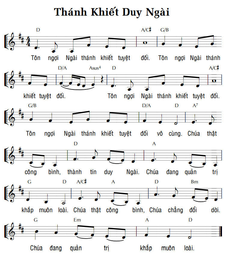 1. Tôn ngợi Ngài thánh khiết tuyệt đối. Tôn ngợi Ngài thánh khiết tuyệt đối. Tôn ngợi Ngài thánh khiết tuyệt đối vô cùng. Chúa thật công bình, thành tín duy Ngài. Chúa đang quản trị khắp muôn loài. Chúa thật công bình, Chúa chẳng đổi dời. Chúa đang quản trị khắp muôn loài.