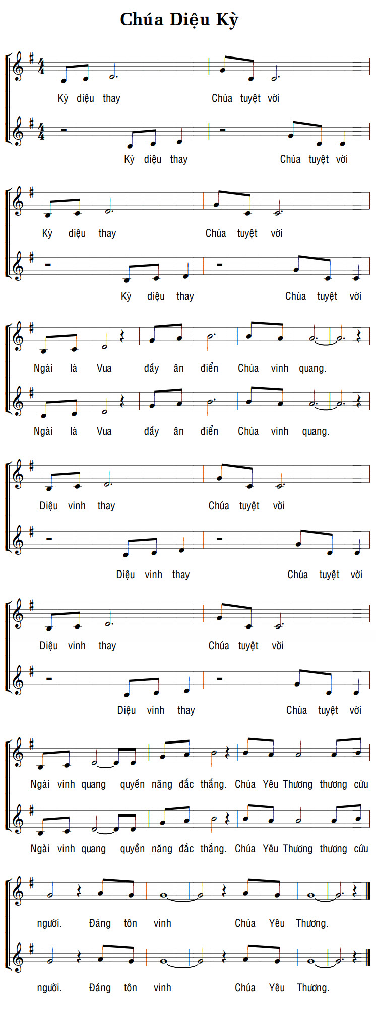 1. Kỳ diệu thay Chúa tuyệt vời Kỳ diệu thay Chúa tuyệt vời Kỳ diệu thay Chúa tuyệt vời Kỳ diệu thay Chúa tuyệt vời Ngài là Vua đầy ân điển Chúa vinh quang. Ngài là Vua đầy ân điển Chúa vinh quang. Diệu vinh thay Chúa tuyệt vời Diệu vinh thay Chúa tuyệt vời Diệu vinh thay Chúa tuyệt vời Diệu vinh thay Chúa tuyệt vời Ngài vinh quang quyền năng đắc thắng. Chúa Yêu Thương thương cứu người. Ngài vinh quang quyền năng đắc thắng. Chúa Yêu Thương thương cứu người. Đáng tôn vinh Chúa Yêu Thương. Đáng tôn vinh Chúa Yêu Thương.