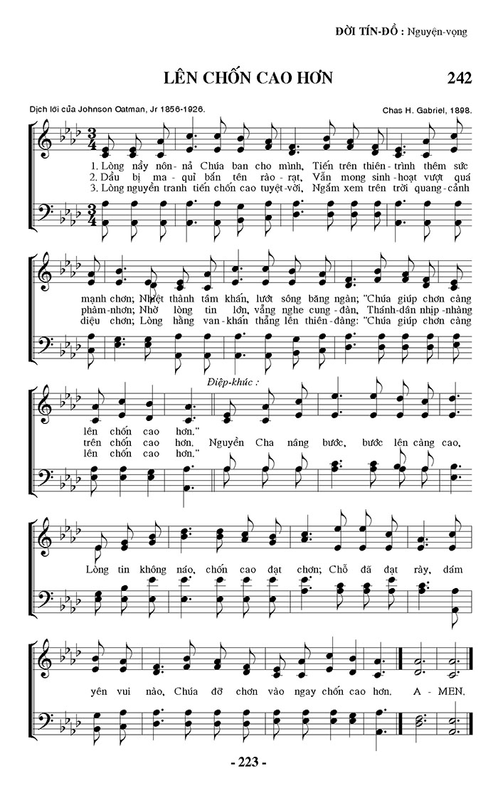 1. Lòng nầy nôn nả Chúa ban cho mình, Tiến trên thiên trình thêm sức mạnh chơn; Nhiệt thành tâm khấn, lướt sông băng ngàn; "Chúa giúp chơn càng." 2. Dầu bị ma quỉ bắn tên rào rạt, Vẫn mong sinh hoạt vượt quá phàm-nhơn; Nhờ lòng tin lớn, vẳng nghe cung đàn, Thánh dân nhịp nhàng. 3. Lòng nguyễn tranh tiến chốn cao tuyệt vời, Ngắm xem trên trời quang cảnh diệu chơn; Lòng hằng van-khẩn thẳng lên thiên đàng: "Chúa giúp chơn càng." Điệp khúc: lên chốn cao hơn." Nguyễn Cha nâng bước, bước lên càng cao, lên chốn cao hơn." Lòng tin không náo, chốn cao đạt chơn; Chỗ đã đạt rày, dám yên vui nào, Chúa đỡ chơn vào ngay chốn cao hơn. A - MEN.