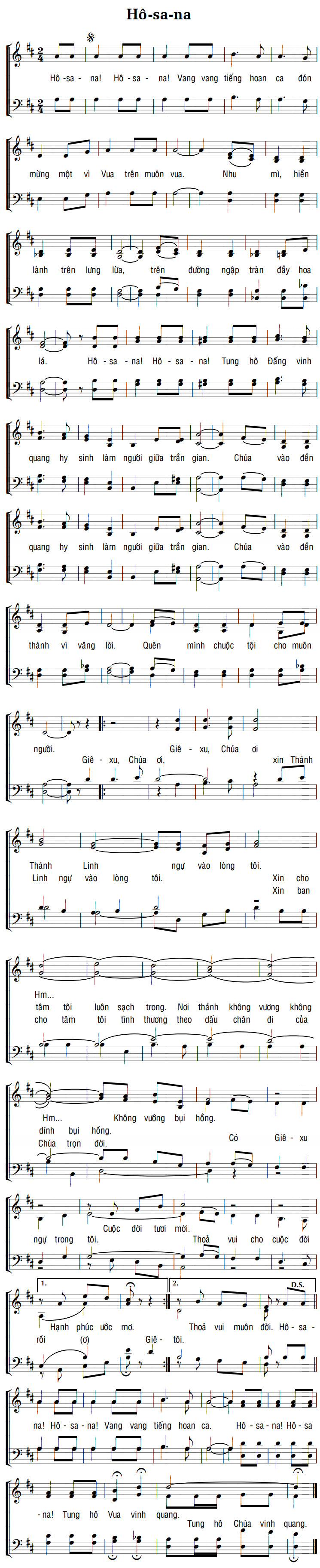 1. Hô-sa-na! Hô-sa-na! Vang vang tiếng hoan ca đón mừng một vì Vua trên muôn vua. Nhu mì, hiển lành trên lưng lừa, trên đường ngập tràn đầy hoa lá. Hô-sa-na! Hô-sa-na! Tung hô Đấng vinh quang hy sinh làm người giữa trần gian. Chúa vào đền thành vì vâng lời. Quên mình chuộc tội cho muôn người. Giê-xu, Chúa ơi, xin Thánh Linh ngự vào lòng tôi. Xin cho tâm tôi luôn sạch trong. Nơi thánh không vướng bụi hồng. Có Giê-xu ngự trong tôi. Cuộc đời tươi mới. Thoả vui cho cuộc đời hạnh phúc ước mơ. Thoả vui muôn đời. 2. Hô-sa-na! Hô-sa-na! Vang vang tiếng hoan ca đón mừng một vì Vua trên muôn vua. Nhu mì, hiển lành trên lưng lừa, trên đường ngập tràn đầy hoa lá. Hô-sa-na! Hô-sa-na! Tung hô Đấng vinh quang hy sinh làm người giữa trần gian. Chúa vào đền thành vì vâng lời. Quên mình chuộc tội cho muôn người. Giê-xu, Chúa ơi, xin Thánh Linh ngự vào lòng tôi. Xin ban cho tâm tôi tình thương theo dấu chân đi của Chúa trọn đời. Có Giê-xu ngự trong tôi. Cuộc đời tươi mới. Thoả vui cho cuộc đời hạnh phúc ước mơ. Giê-tôi. Điệp khúc: Hô-sa-na! Hô-sa-na! Vang vang tiếng hoan ca. Hô-sa-na! Hô-sa-na! Tung hô Vua vinh quang. Tung hô Chúa vinh quang.