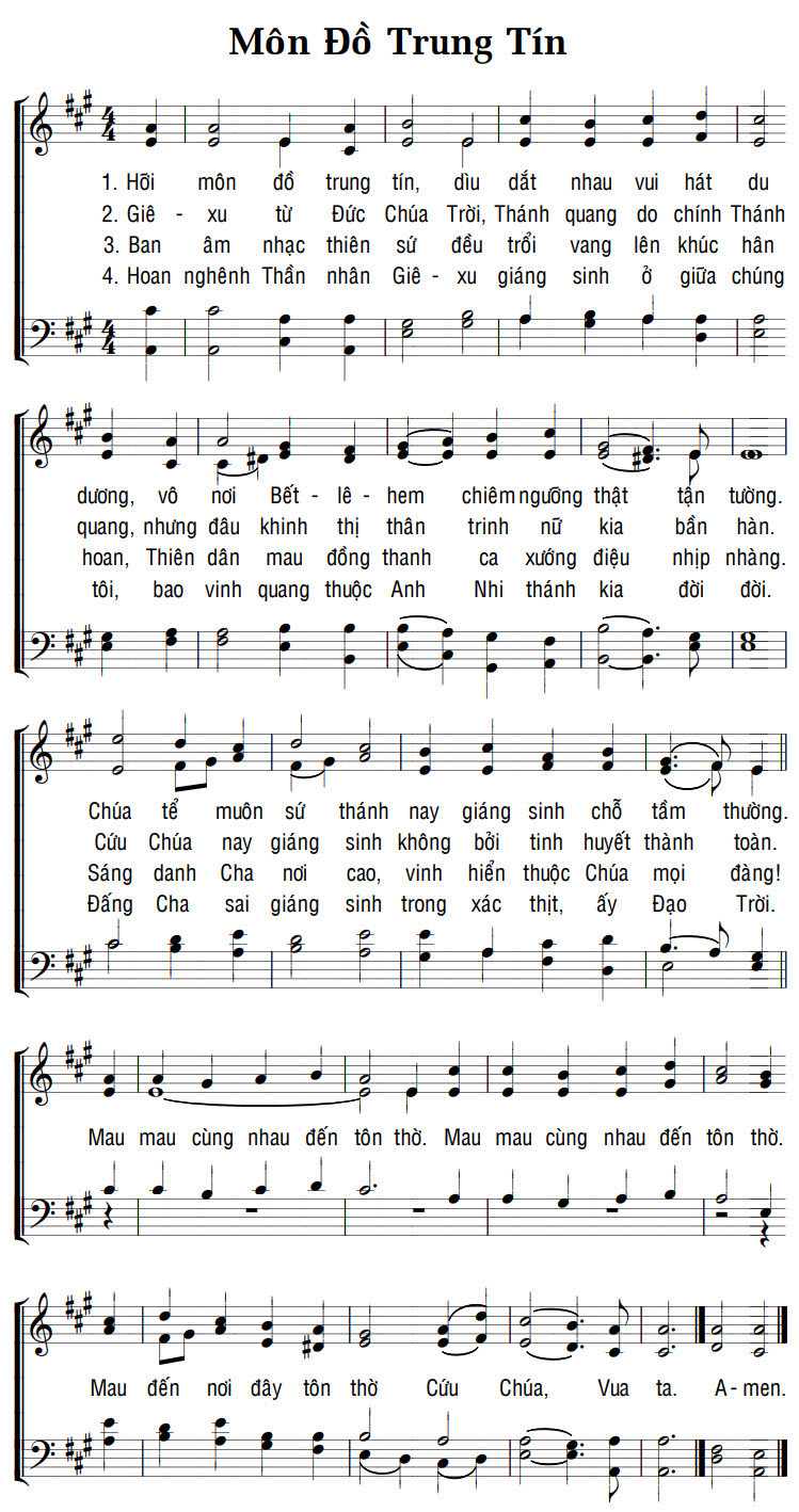1. Hỡi môn đồ trung tín, dìu dắt nhau vui hát du dương, vô nơi Bết-lê-hem chiêm ngưỡng thật tận tường. Chúa tể muôn sứ thánh nay giáng sinh chỗ tầm thường. 2. Giê-xu từ Đức Chúa Trời, Thánh quang do chính Thánh quang, nhưng đâu khinh thị thân trinh nữ kia bần hàn. Cứu Chúa nay giáng sinh không bởi tinh huyết thành toàn. 3. Ban âm nhạc thiên sứ đều trổi vang lên khúc hân hoan, Thiên dân mau đồng thanh ca xướng điệu nhịp nhàng. Sáng danh Cha nơi cao, vinh hiển thuộc Chúa mọi đàng! 4. Hoan nghênh Thần nhân Giê-xu giáng sinh ở giữa chúng tôi, bao vinh quang thuộc Anh Nhi thánh kia đời đời. Đấng Cha sai giáng sinh trong xác thịt, ấy Đạo Trời. Điệp khúc: Mau mau cùng nhau đến tôn thờ. Mau mau cùng nhau đến tôn thờ. Mau đến nơi đây tôn thờ Cứu Chúa, Vua ta. A-men.