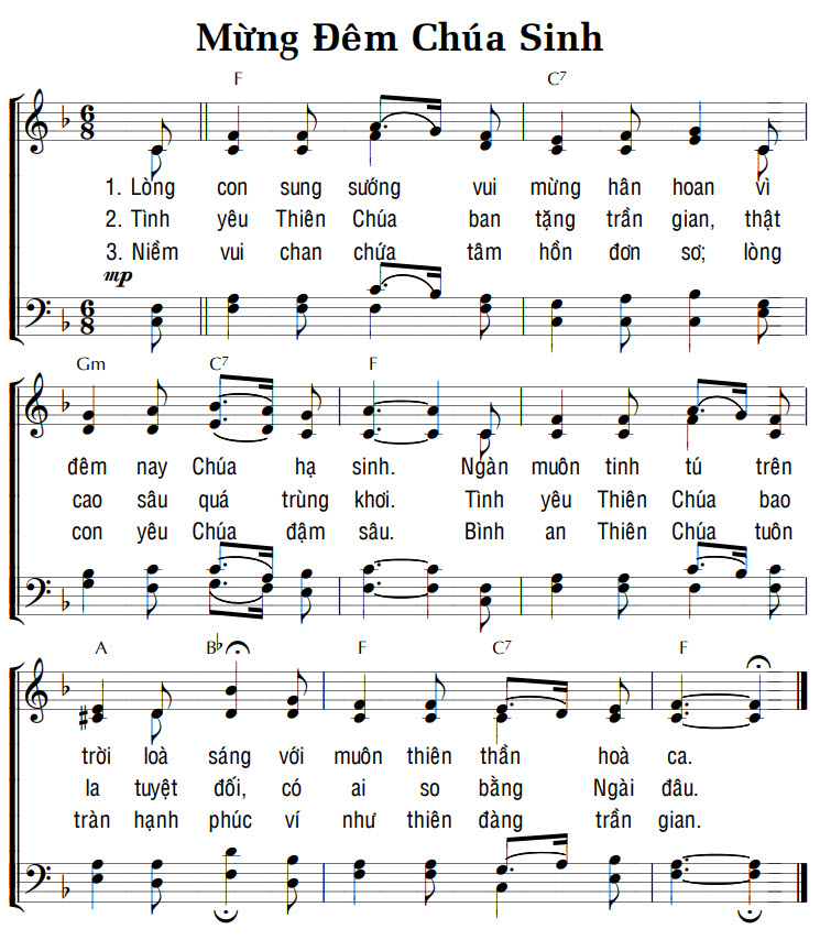 1. Lòng con sung sướng vui mừng hân hoan vì đêm nay Chúa hạ sinh. Ngàn muôn tinh tú trên trời loà sáng với muôn thiên thần hoà ca. 2. Tình yêu Thiên Chúa ban tặng trần gian, thật cao sâu quá trùng khơi. Tình yêu Thiên Chúa bao la tuyệt đối, có ai so bằng Ngài đâu. 3. Niềm vui chan chứa tâm hồn đơn sơ; lòng con yêu Chúa đậm sâu. Bình an Thiên Chúa tuôn tràn hạnh phúc ví như thiên đàng trần gian.