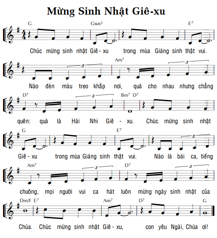 1. Chúc mừng sinh nhật Giê - xu trong mùa Giáng sinh thật vui. Nào đèn màu treo khắp nơi, quà cho nhau nhưng chẳng quên: quà là Hài Nhi Giê - xu. Chúc mừng sinh nhật Giê - xu trong mùa Giáng sinh thật vui. Nào là bài ca, tiếng chuông, mọi người vui ca hát luôn mừng ngày sinh nhật của Chúa. Chúc mừng sinh nhật Giê - xu, con yêu Ngài, Chúa ơi!