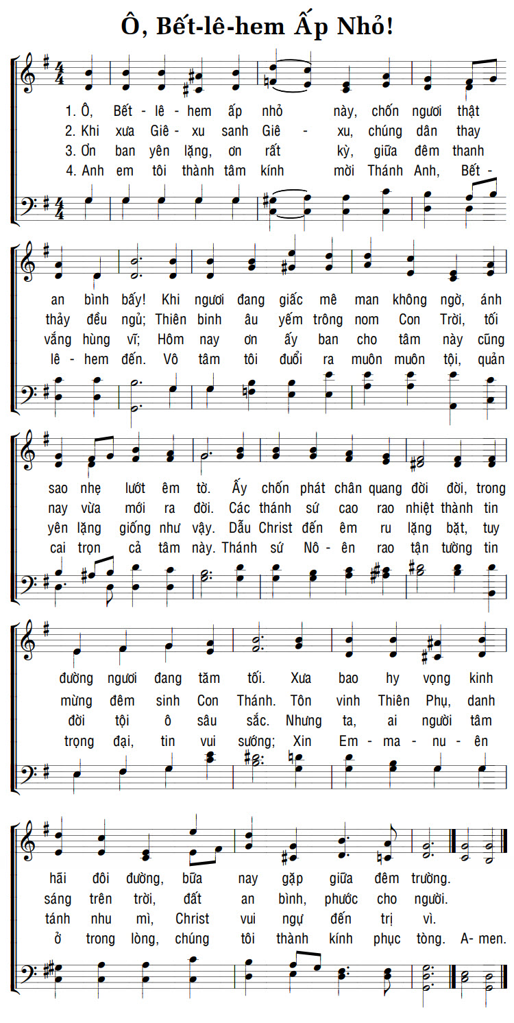 1. Ô, Bết-lê-hem ấp nhỏ này, chốn ngươi thật an bình bấy! Khi người đang giấc mê man không ngờ, ánh sao nhẹ lướt êm tờ. Ấy chốn phát chân quang đời đời, trong đường ngươi đang tăm tối. Xưa bao hy vọng kinh hãi đôi đường, bữa nay gặp giữa đêm trường. 2. Khi xưa Giê-xu sanh Giê-xu, chúng dân thay thảy đều ngủ; Thiên binh âu yếm trông nom Con Trời, tối nay vừa mới ra đời. Các thánh sứ cao rao nhiệt thành tin mừng đêm sinh Con Thánh. Tôn vinh Thiên Phụ, danh sáng trên trời, đất an bình, phước cho người. 3. Ơn ban yên lặng, ơn rất kỳ, giữa đêm thanh vắng hùng vĩ; Hôm nay ơn ấy ban cho tâm này cũng yên lặng giống như vậy. Dẫu Christ đến êm ru lặng bặt, tuy đời tội Ô sâu sắc. Nhưng ta, ai người tâm tánh nhu mì, Christ vui ngự đến trị vì. 4. Anh em tôi thành tâm kính mời Thánh Anh, Bết-lê-hem đến. Vô tâm tôi đuổi ra muôn muôn tội, quản cai trọn cả tâm này. Thánh sứ Nô-ên rao tận tường tin trọng đại, tin vui sướng; Xin Em-ma-nu-ên ở trong lòng, chúng tôi thành kính phục tòng. A-men.