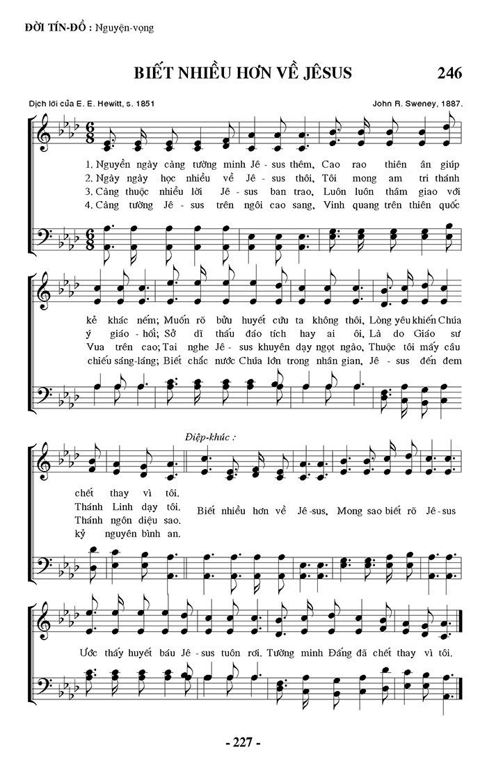 1. Nguyện ngày càng tường minh Jê-sus thêm, Cao rao thiên ân giúp kẻ khác nếm; Muốn rõ bửu huyết cứu ta không thôi, Lòng yêu khiến Chúa chết thay vì tôi. 2. Ngày ngày học nhiều về Jê-sus thôi, Tôi mong am tri thánh ý giáo - hối; Sở dĩ thấu đáo tích hay ai ôi, Là do Giáo Sư Thánh Linh dạy tôi. 3. Càng thuộc nhiều lời Jê-sus ban trao, Luôn luôn thâm giao với Vua trên cao; Tai nghe Jê-sus khuyên dạy ngọt ngào, Thuộc tôi mấy câu Thánh ngôn diệu sao. 4. Càng tường Jê-sus trên ngôi cao sang, Vinh quang trên thiên quốc chiếu sáng-láng; Biết chắc nước Chúa lớn trong nhân gian, Jê-sus đến đem kỷ nguyên bình an. Điệp khúc: Biết nhiều hơn về Jê-sus, Mong sao biết rõ Jê-sus. Ước thấy huyết báu Jê-sus tuôn rơi. Tường minh Đấng đã chết thay vì tôi.