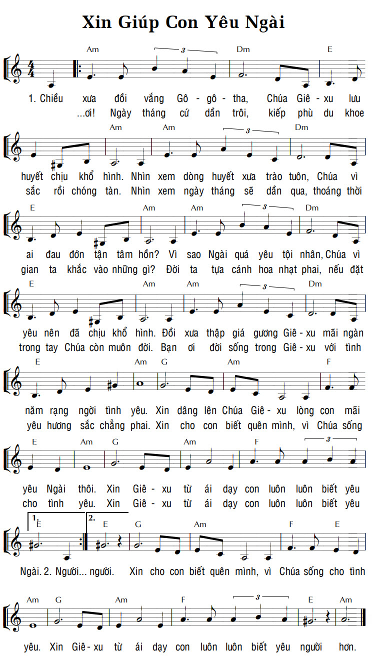 1. Chiều xưa đồi vắng Gô-gô-tha, Chúa Giê-xu lưu huyết chịu khổ hình. Nhìn xem dòng huyết xưa trào tuôn, Chúa vì ai đau đớn tận tâm hồn? Vì sao Ngài quá yêu tội nhân, Chúa vì yêu nên đã chịu khổ hình. Đồi xưa thập giá gương Giê-xu mãi ngàn năm rạng ngời tình yêu. Xin dâng lên Chúa Giê-xu lòng con mãi yêu Ngài thôi. Xin Giê-xu từ ái dạy con luôn luôn biết yêu. 2. ...ơi! Ngày tháng cứ dần trôi, kiếp phù du khoe sắc rồi chóng tàn. Nhìn xem ngày tháng sẽ dần qua, thoáng thời gian ta khắc vào những gì? Đời ta tựa cánh hoa nhạt phai, nếu đặt trong tay Chúa còn muôn đời. Bạn ơi đời sống trong Giê-xu với tình yêu hương sắc chẳng phai. Xin cho con biết quên mình, vì Chúa sống cho tình Ngài. Người... người. Xin cho con biết quên mình, vì Chúa sống cho tình yêu. Xin Giê-xu từ ái dạy con luôn luôn biết yêu người hơn.