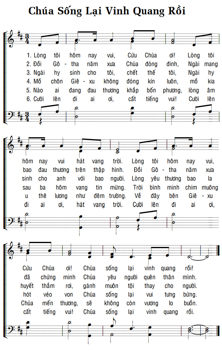 1. Lòng tôi hôm nay vui, Cứu Chúa ơi! Lòng tôi hôm nay vui hát vang trời. Lòng tôi hôm nay vui, Cứu Chúa ơi! Chúa sống lại vinh quang rồi! 2. Đồi Gô-tha năm xưa Chúa đóng đinh, Ngài mang bao đau thương trên thập hình. Đồi Gô-tha năm xưa đã chứng minh Chúa yêu người quên thân mình. 3. Ngài hy sinh cho tôi, chết thế tôi, Ngài hy sinh cho anh với bao người. Lòng yêu thương bao la huyết thắm rơi, gánh muôn tội thay cho người. 4. Mồ chôn Giê - Xu, Giê-xu không đóng kín luôn, mồ kia sau ba hôm vang tin mừng. Trời bình minh chim muông hót véo von Chúa sống lại vui tưng bừng. 5. Nào ai đang đau thương khắp bốn phương, lòng âm u thê lương như đêm trường. Về đây bên Giê-xu Chúa mến thương, sẽ không còn vương lo buồn. 6. Cười lên đi ai ơi, cất tiếng vui! Cười lên đi ai ơi, hát vang trời. Cười lên đi ai ơi, cất tiếng vui! Chúa sống lại vinh quang rồi.