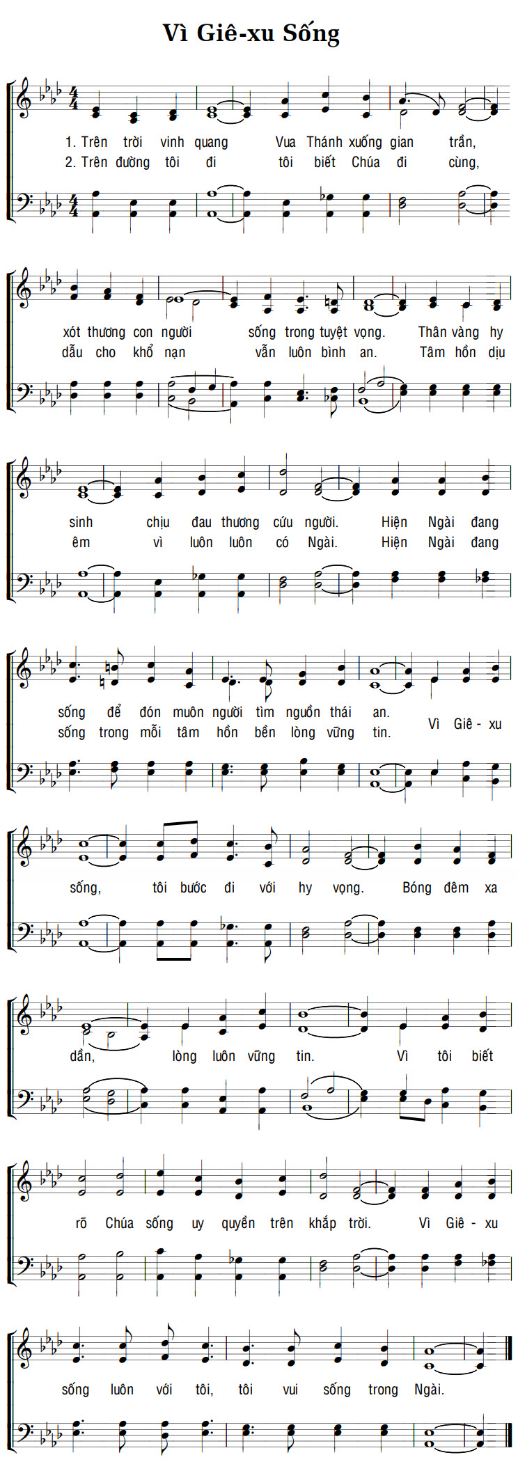 1. Trên trời vinh quang Vua Thánh xuống gian trần, xót thương con người sống trong tuyệt vọng. sinh chịu đau thương cứu người. Hiện Ngài đang sống để đón muôn người tìm nguồn thái an. sống, tôi bước đi với hy vọng. Bóng đêm xa dần, lòng luôn vững tin. Vì tôi biết rõ Chúa sống uy quyền trên khắp trời. Vì Giê-xu sống luôn với tôi, tôi vui sống trong Ngài. 2. Trên đường tôi đi tôi biết Chúa đi cùng, dẫu cho khổ nạn vẫn luôn bình an. Thân vàng hy êm vì luôn luôn có Ngài. Hiện Ngài đang sống trong mỗi tâm hồn bền lòng vững tin. sống, tôi bước đi với hy vọng. Bóng đêm xa dần, lòng luôn vững tin. Vì tôi biết rõ Chúa sống uy quyền trên khắp trời. Vì Giê-xu sống luôn với tôi, tôi vui sống trong Ngài.