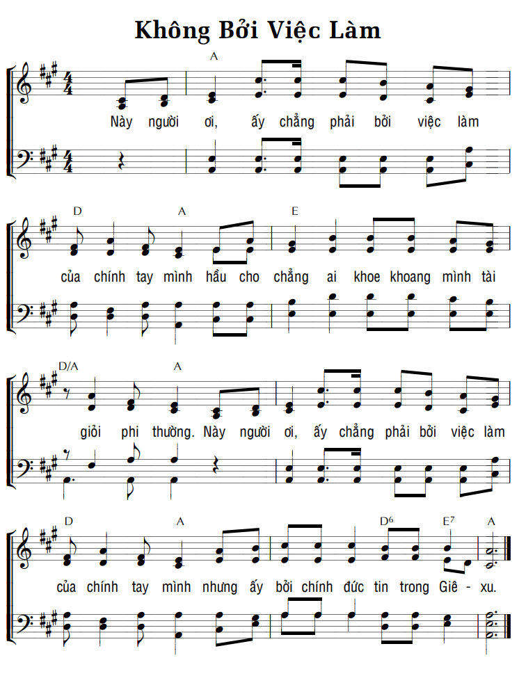 1. Này người ơi, ấy chẳng phải bởi việc làm của chính tay mình hầu cho chẳng ai khoe khoang mình tài giỏi phi thường. Này người ơi, ấy chẳng phải bởi việc làm của chính tay mình nhưng ấy bởi chính đức tin trong Giê-xu.