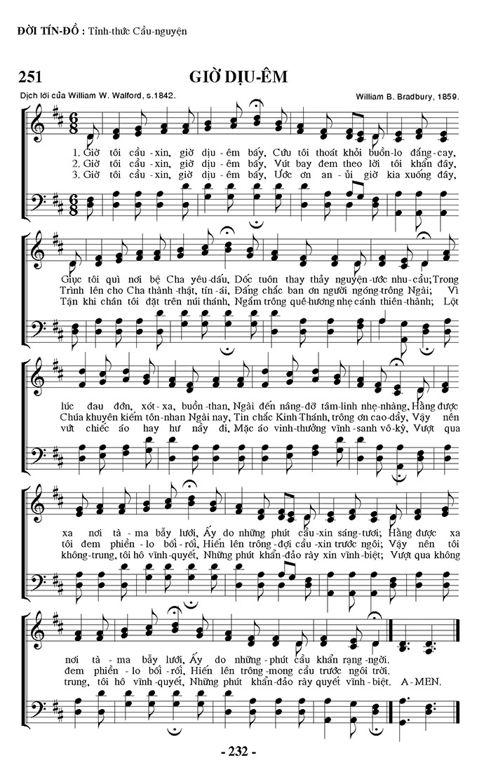 1. Giờ tôi cầu xin, giờ dịu êm bấy, Cứu tôi thoát khỏi buồn-lo đắng-cay, Giục tôi quì nơi bệ Cha yêu dấu, Dốc tuôn thay thảy nguyện-ước nhu-cầu; lúc đau đớn, xót-xa, buồn-than, Ngài đến nâng-đỡ tâm-linh nhẹ-nhàng, Hằng được xa nơi tà ma bẫy lưới, Ấy do những phút cầu xin sáng-tươi; Hằng được 2. Giờ tôi cầu xin, giờ dịu êm bấy, Vút bay đem theo lời tôi khẩn đây, Trình lên cho Cha thành-thật, tín-ái, Đấng chắc ban ơn người ngóng-trông Ngài; Chúa khuyên kiếm tôn-nhan Ngài nay, Tin chắc Kinh Thánh, trông ơn cao dầy, Vậy nên tôi đem phiền - lo bối-rối, Hiến lên trông-đợi cầu-xin trước ngôi; Vậy nên tôi 3. Giờ tôi cầu xin, giờ dịu êm bấy, Ước ơn an-ủi giờ kia xuống đây, Tận khi chân tôi đặt trên núi thánh, Ngắm trông quê-hương nhẹ cánh thiên-thành; Lột vứt chiếc áo hay hư nấy đi, Mặc áo vinh-thưởng vĩnh-sanh vô-kỳ, Vượt qua không-trung, tôi hô vĩnh-quyết, Những phút khẩn-đảo rày xin vĩnh-biệt; Vượt qua không nơi tà ma bẫy lưới, Ấy do những phút cầu khẩn rạng ngời. đem phiền lo bối rối, Hiến lên trông mong cầu trước ngôi trời. trung, tôi hồ vĩnh quyết, Những phút khẩn đảo rày quyết vĩnh biệt. A-MEN.