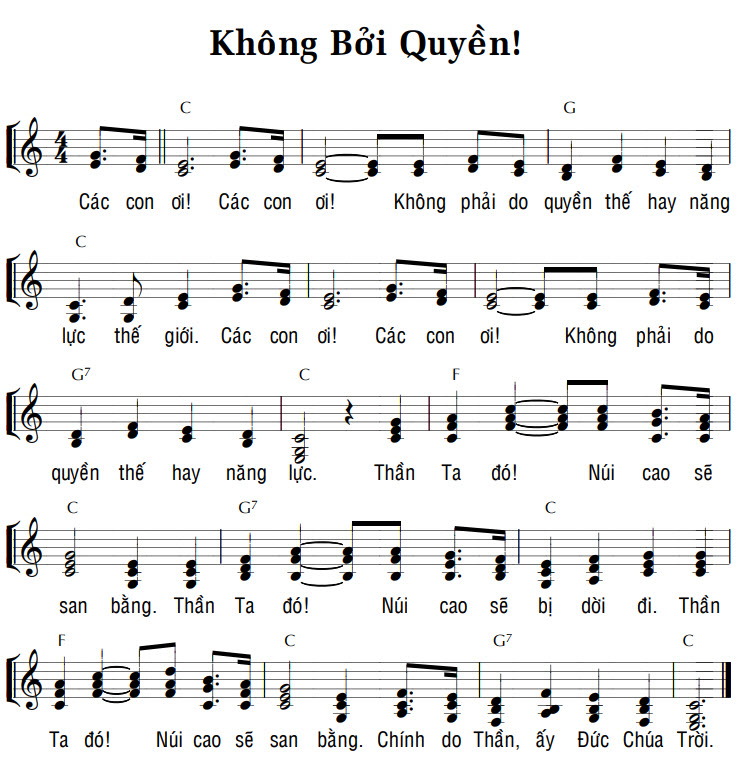 1. Các con ơi! Các con ơi! Không phải do quyền thế hay năng lực thế giới. Các con ơi! Các con ơi! Không phải do quyền thế hay năng lực. Thần Ta đó! Núi cao sẽ san bằng. Thần Ta đó! Núi cao sẽ bị dời đi. Thần Ta đó! Núi cao sẽ san bằng. Chính do Thần, ấy Đức Chúa Trời.