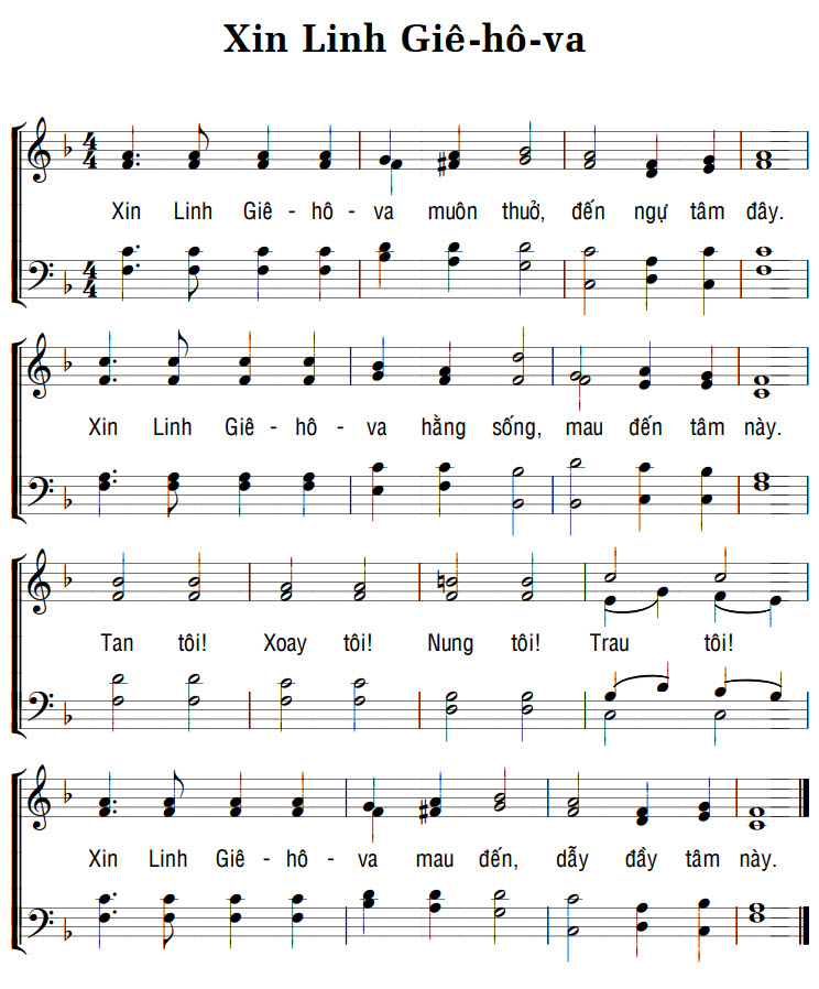 1. Xin Linh Giê-hô-va muôn thuở, đến ngự tâm đây. 2. Xin Linh Giê-hô-va hằng sống, mau đến tâm này. 3. Tan tôi! Xoay tôi! Nung tôi! Trau tôi! Xin Linh Giê-hô-va mau đến, dẫy đầy tâm này.