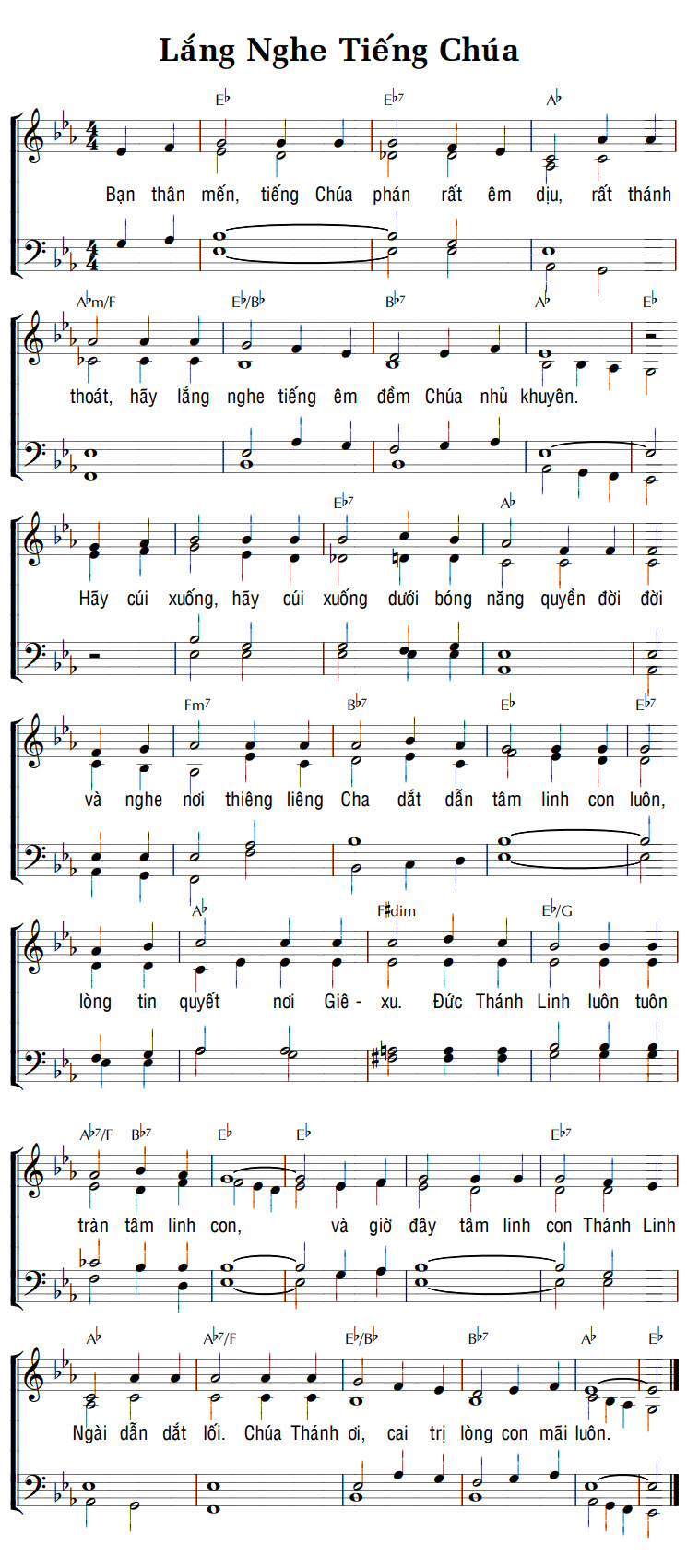 1. Bạn thân mến, tiếng Chúa phán rất êm dịu, rất thánh thoát, hãy lắng nghe tiếng êm đềm Chúa nhủ khuyên. Hãy cúi xuống, hãy cúi xuống dưới bóng năng quyền đời đời và nghe nơi thiêng liêng Cha dắt dẫn tâm linh con luôn, lòng tin quyết nơi Giê-xu. Đức Thánh Linh luôn tuôn tràn tâm linh con, và giờ đây tâm linh con Thánh Linh Ngài dẫn dắt lối. Chúa Thánh ơi, cai trị lòng con mãi luôn.