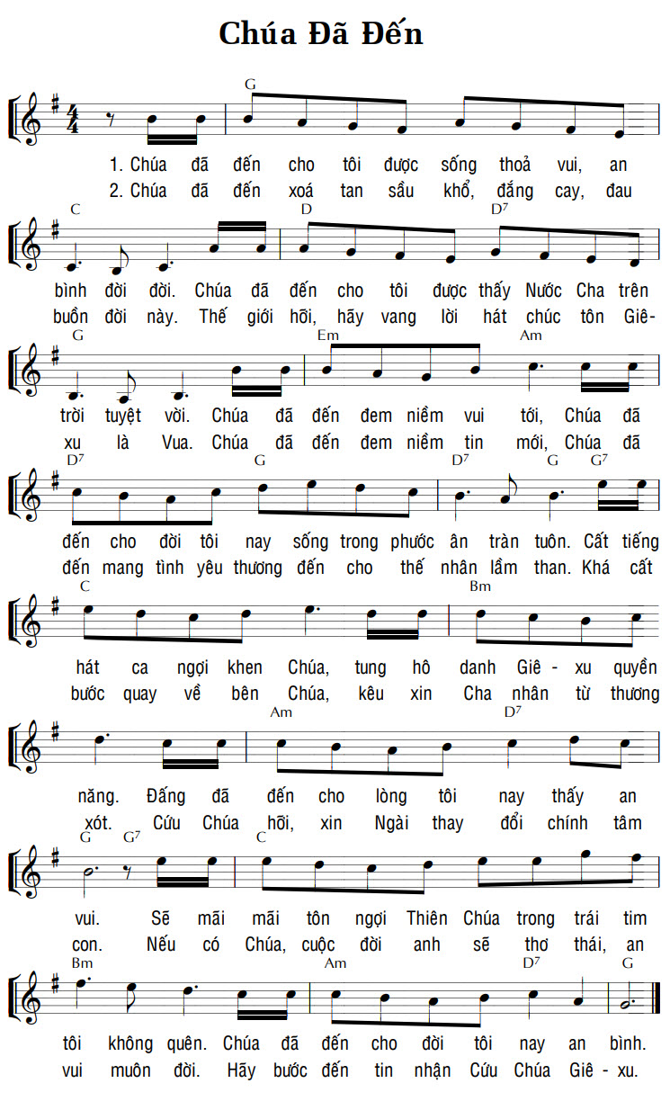1. Chúa đã đến cho tôi được sống thoả vui, an bình đời đời. Chúa đã đến cho tôi được thấy Nước Cha trên trời tuyệt vời. Chúa đã đến đem niềm vui tới, Chúa đã đến cho đời tôi nay sống trong phước ân tràn tuôn. Cất tiếng hát ca ngợi khen Chúa, tung hô danh Giê-xu quyền năng. Đấng đã đến cho lòng tôi nay thấy an vui. Sẽ mãi mãi tôn ngợi Thiên Chúa trong trái tim tôi không quên. Chúa đã đến cho đời tôi nay an bình. 2. Chúa đã đến xoá tan sầu khổ, đắng cay, đau buồn đời này. Thế giới hỡi, hãy vang lời hát chúc tôn Giê-xu là Vua. Chúa đã đến đem niềm tin mới, Chúa đã đến mang tình yêu thương đến cho thế nhân lầm than. Khá cất bước quay về bên Chúa, kêu xin Cha nhân từ thương xót. Cứu Chúa hỡi, xin Ngài thay đổi chính tâm con. Nếu có Chúa, cuộc đời anh sẽ thơ thái, an vui muôn đời. Hãy bước đến tin nhận Cứu Chúa Giê-xu.