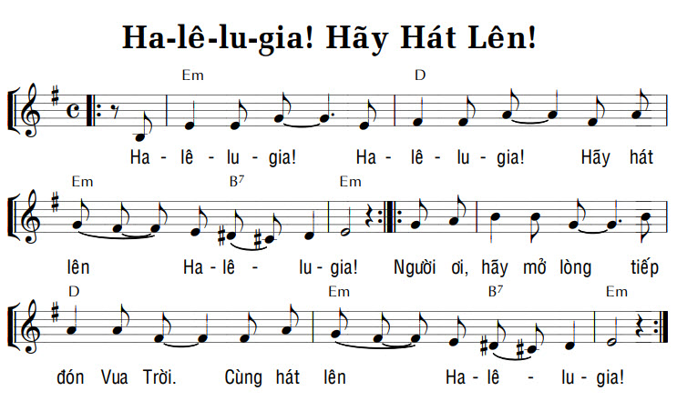 Điệp khúc: Ha-lê-lu-gia! Ha-lê-lu-gia! Hãy hát lên Ha-lê-lu-gia! Người ơi, hãy mở lòng tiếp đón Vua Trời. Cùng hát lên Ha-lê-lu-gia!