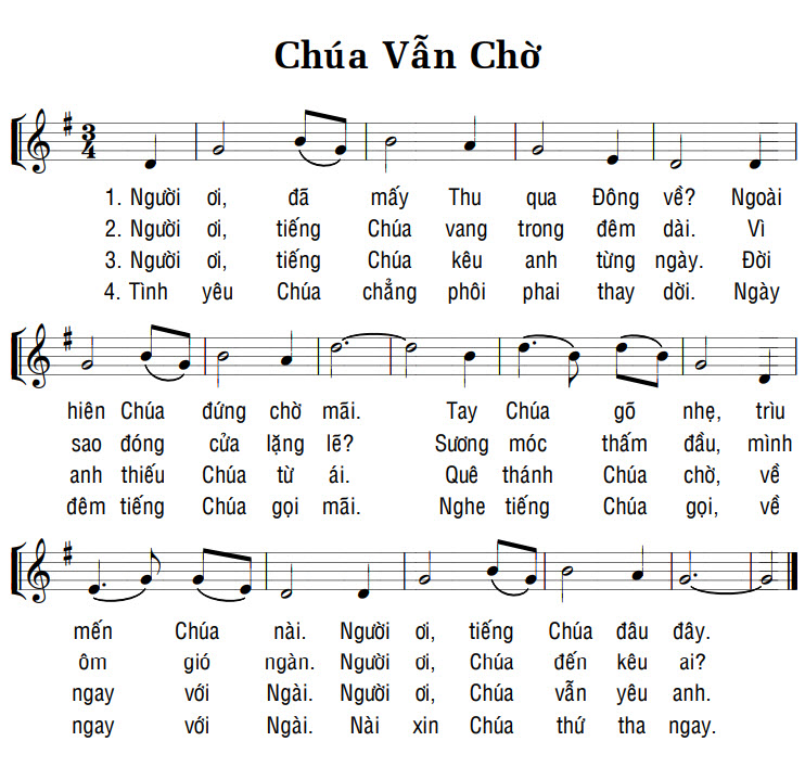 1. Người ơi, đã mấy Thu qua Đông về? Ngoài hiên Chúa đứng chờ mãi. Tay Chúa gõ nhẹ, trìu mến Chúa nài. Người ơi, tiếng Chúa đâu đây. 2. Người ơi, tiếng Chúa vang trong đêm dài. Vì sao đóng cửa lặng lẽ? Sương móc thấm đầu, mình ôm gió ngàn. Người ơi, Chúa đến kêu ai? 3. Người ơi, tiếng Chúa kêu anh từng ngày. Đời anh thiếu Chúa từ ái. Quê thánh Chúa chờ, về ngay với Ngài. Người ơi, Chúa vẫn yêu anh. 4. Tình yêu Chúa chẳng phôi phai thay dời. Ngày đêm tiếng Chúa gọi mãi. Nghe tiếng Chúa gọi, về ngay với Ngài. Nài xin Chúa thứ tha ngay.