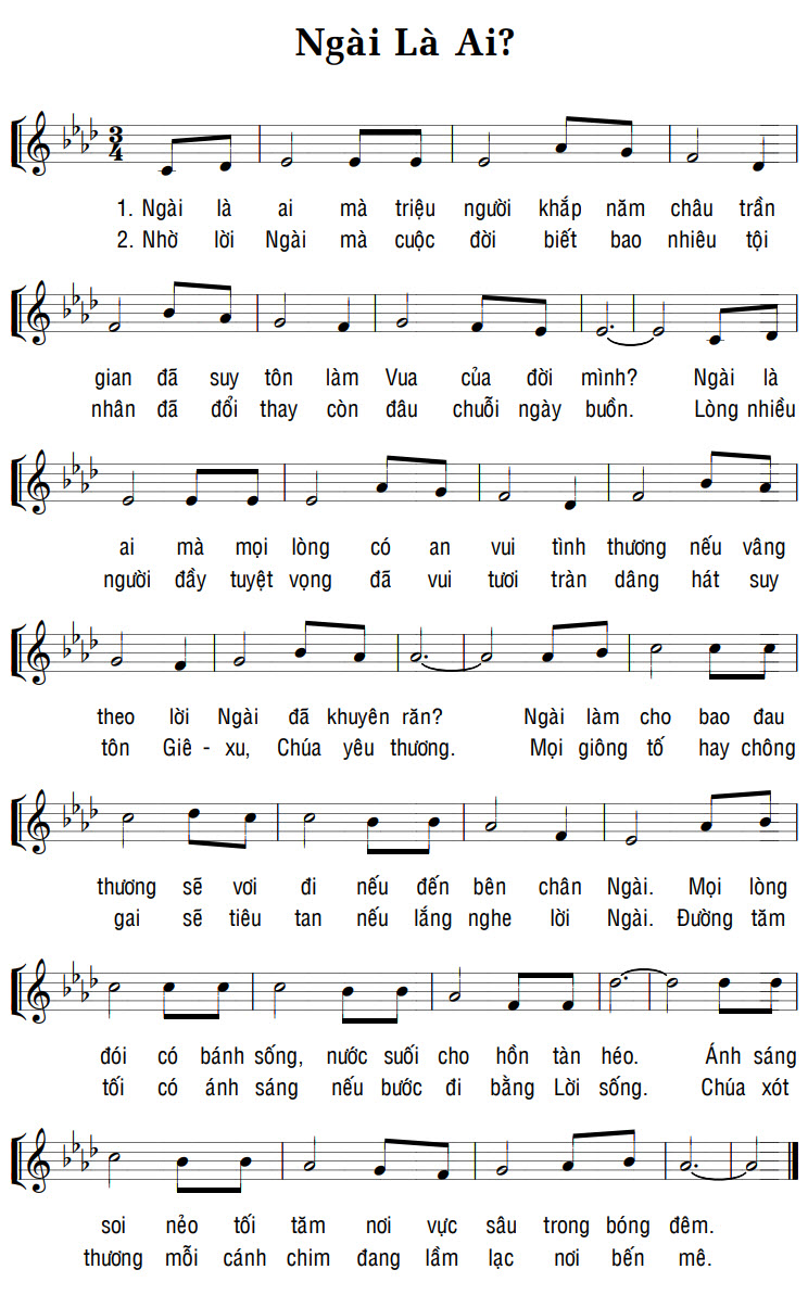 1. Ngài là ai mà triệu người khắp năm châu trần gian đã suy tôn làm Vua của đời mình? Ngài là ai mà mọi lòng có an vui tình thương nếu vâng theo lời Ngài đã khuyên răn? Ngài làm cho bao đau thương sẽ vơi đi nếu đến bên chân Ngài. Mọi lòng đói có bánh sống, nước suối cho hồn tàn héo. Ánh sáng soi nẻo tối tăm nơi vực sâu trong bóng đêm. 2. Nhờ lời Ngài mà cuộc đời biết bao nhiêu tội nhân đã đổi thay còn đâu chuỗi ngày buồn. Lòng nhiều người đầy tuyệt vọng đã vui tươi tràn dâng hát suy tôn Giê-xu, Chúa yêu thương. Mọi giông tố hay chông gai sẽ tiêu tan nếu lắng nghe lời Ngài. Đường tăm tối có ánh sáng nếu bước đi bằng Lời sống. Chúa xót thương mỗi cánh chim đang lầm lạc nơi bến mê.