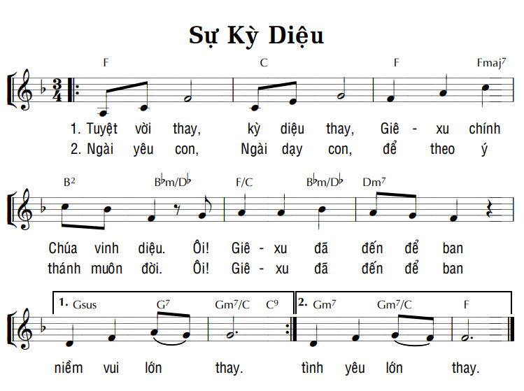 1. Tuyệt vời thay, kỳ diệu thay, Giê-xu chính Chúa vinh diệu. Ôi! Giê-xu đã đến để ban niềm vui lớn thay. 2. Ngài yêu con, Ngài dạy con, để theo ý thánh muôn đời. Ôi! Giê-xu đã đến để ban tình yêu lớn thay.