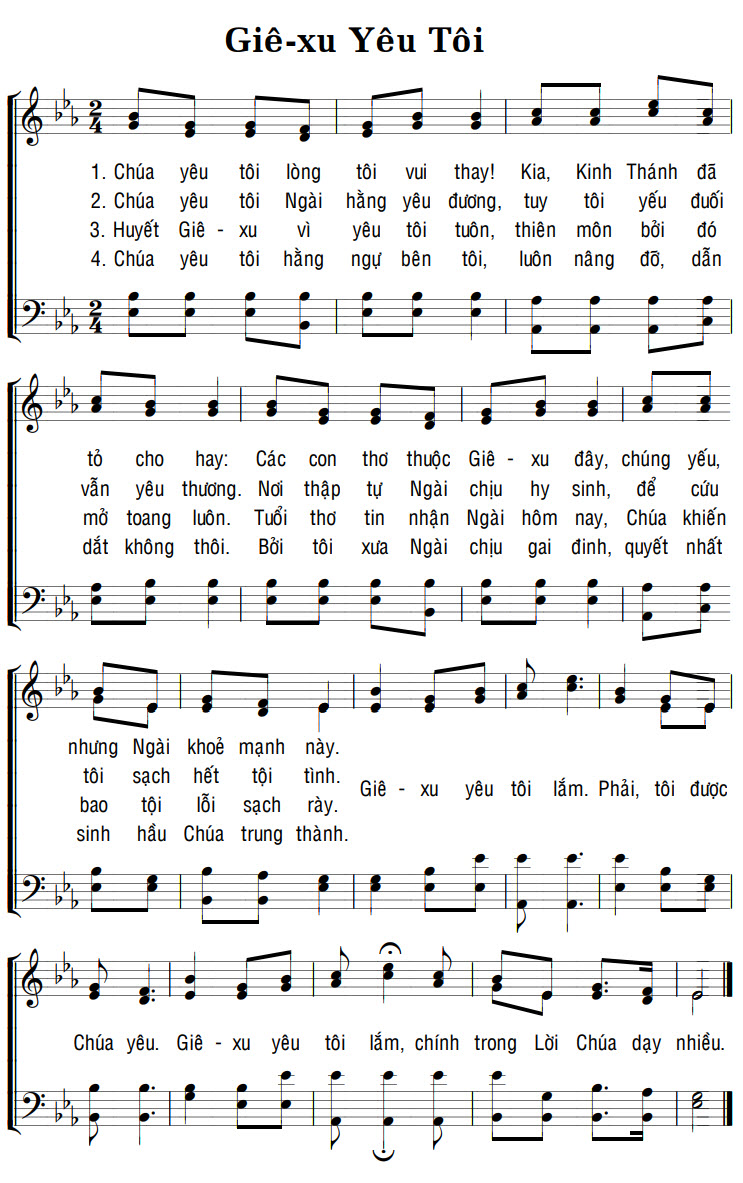 1. Chúa yêu tôi lòng tôi vui thay! Kia, Kinh Thánh đã tỏ cho hay: Các con thơ thuộc Giê-xu đây, chúng yếu, nhưng Ngài khoẻ mạnh này. 2. Chúa yêu tôi Ngài hằng yêu đương, tuy tôi yếu đuối vẫn yêu thương. Nơi thập tự Ngài chịu hy sinh, để cứu tôi sạch hết tội tình. 3. Huyết Giê-xu vì yêu tôi tuôn, thiên môn bởi đó mở toang luôn. Tuổi thơ tin nhận Ngài hôm nay, Chúa khiến bao tội lỗi sạch rày. 4. Chúa yêu tôi hằng ngự bên tôi, luôn nâng đỡ, dẫn dắt không thôi. Bởi tôi xưa Ngài chịu gai đinh, quyết nhất sinh hầu Chúa trung thành. Điệp khúc: Chúa yêu. Giê-xu yêu tôi lắm, chính trong Lời Chúa dạy nhiều.