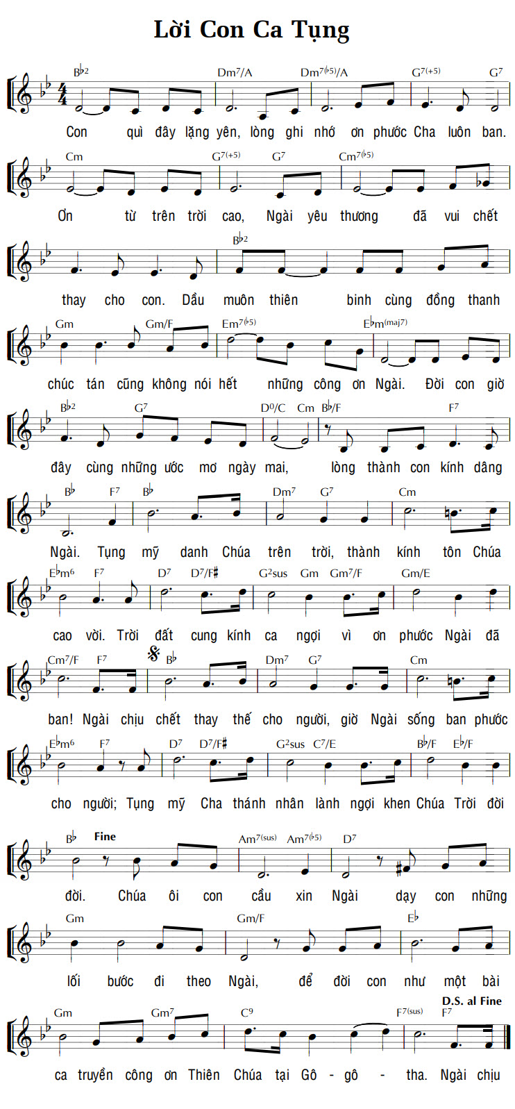 1. Con quì đây lặng yên, lòng ghi nhớ ơn phước Cha luôn ban. Ơn từ trên trời cao, Ngài yêu thương đã vui chết thay cho con. Dầu muôn thiên binh cùng đồng thanh chúc tán cũng không nói hết những công ơn Ngài. Đời con giờ đây cùng những ước mơ ngày mai, lòng thành con kính dâng Ngài. Điệp khúc: Tụng mỹ danh Chúa trên trời, thành kính tôn Chúa cao vời. Trời đất cung kính ca ngợi vì ơn phước Ngài đã ban! Ngài chịu chết thay thế cho người, giờ Ngài sống ban phước cho người; Tụng mỹ Cha thánh nhân lành ngợi khen Chúa Trời đời đời. Chúa ôi con cầu xin Ngài dạy con những lối bước đi theo Ngài, để đời con như một bài ca truyền công ơn Thiên Chúa tại Gô-gô-tha. Ngài chịu