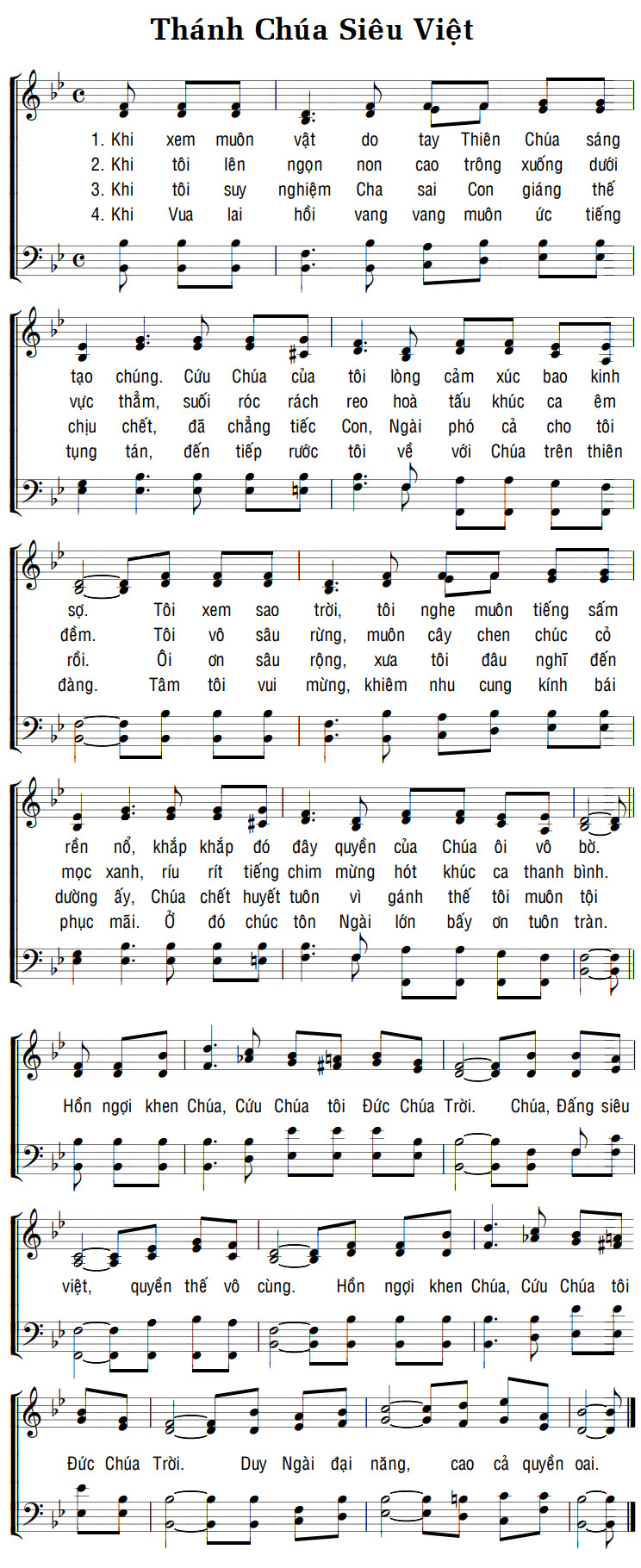1. Khi xem muôn vật do tay Thiên Chúa sáng tạo chúng. Cứu Chúa của tôi lòng cảm xúc bao kinh sợ. Tôi xem sao trời, tôi nghe muôn tiếng sấm rền nổ, khắp khắp đó đây quyền của Chúa ôi vô bờ. 2. Khi tôi lên ngọn non cao trông xuống dưới vực thẳm, suối róc rách reo hoà tấu khúc ca êm đềm. Tôi vô sâu rừng, muôn cây chen chúc cỏ mọc xanh, ríu rít tiếng chim mừng hót khúc ca thanh bình. 3. Khi tôi suy nghiệm Cha sai Con giáng thế chịu chết, đã chẳng tiếc Con, Ngài phó cả cho tôi rồi. Ôi ơn sâu rộng, xưa tôi đâu nghĩ đến dường ấy, Chúa chết huyết tuôn vì gánh thế tôi muôn tội. 4. Khi Vua lai hồi vang vang muôn ức tiếng tụng tán, đến tiếp rước tôi về với Chúa trên thiên đàng. Tâm tôi vui mừng, khiêm nhu cung kính bái phục mãi. Ở đó chúc tôn Ngài lớn bấy ơn tuôn tràn. Điệp khúc: Hồn ngợi khen Chúa, Cứu Chúa tôi Đức Chúa Trời. Chúa, Đấng siêu việt, quyền thế vô cùng. Hồn ngợi khen Chúa, Cứu Chúa tôi Đức Chúa Trời. Duy Ngài đại năng, cao cả quyền oai.