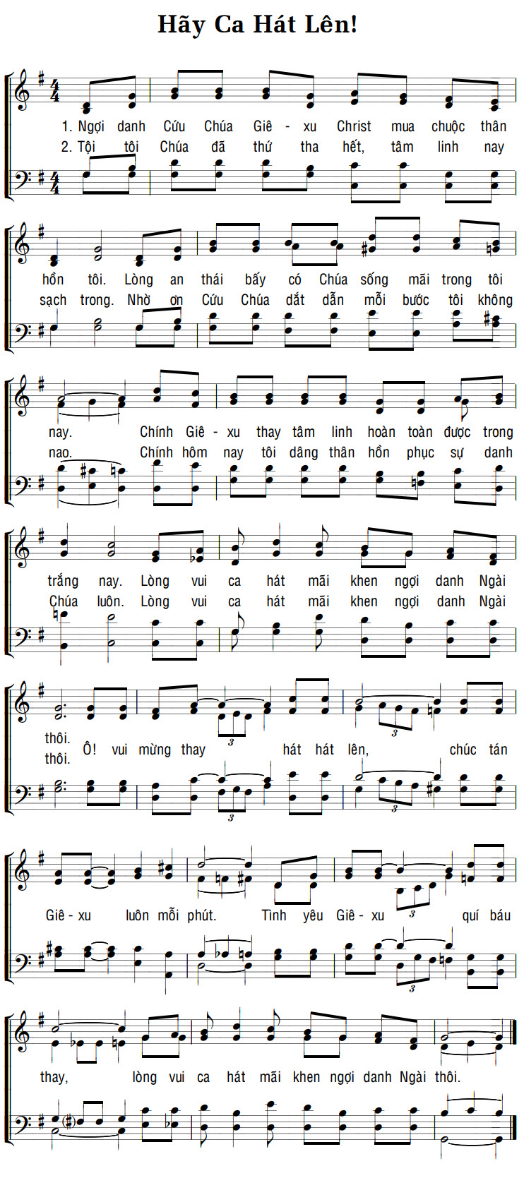 1. Ngợi danh Cứu Chúa Giê-xu Christ mua chuộc thân hồn tôi. Lòng an thái bấy có Chúa sống mãi trong tôi nay. Chính Giê-xu thay tâm linh hoàn toàn được trong trắng nay. Lòng vui ca hát mãi khen ngợi danh Ngài thôi. Ô! vui mừng thay hát hát lên, chúc tán Giê-xu luôn mỗi phút. Tình yêu Giê-xu quí báu thay, lòng vui ca hát mãi khen ngợi danh Ngài thôi. 2. Tội tôi Chúa đã thứ tha hết, tâm linh nay sạch trong. Nhờ ơn Cứu Chúa dắt dẫn mỗi bước tôi không nao. Chính hôm nay tôi dâng thân hồn phục sự danh Chúa luôn. Lòng vui ca hát mãi khen ngợi danh Ngài thôi. Ô! vui mừng thay hát hát lên, chúc tán Giê-xu luôn mỗi phút. Tình yêu Giê-xu quí báu thay, lòng vui ca hát mãi khen ngợi danh Ngài thôi.