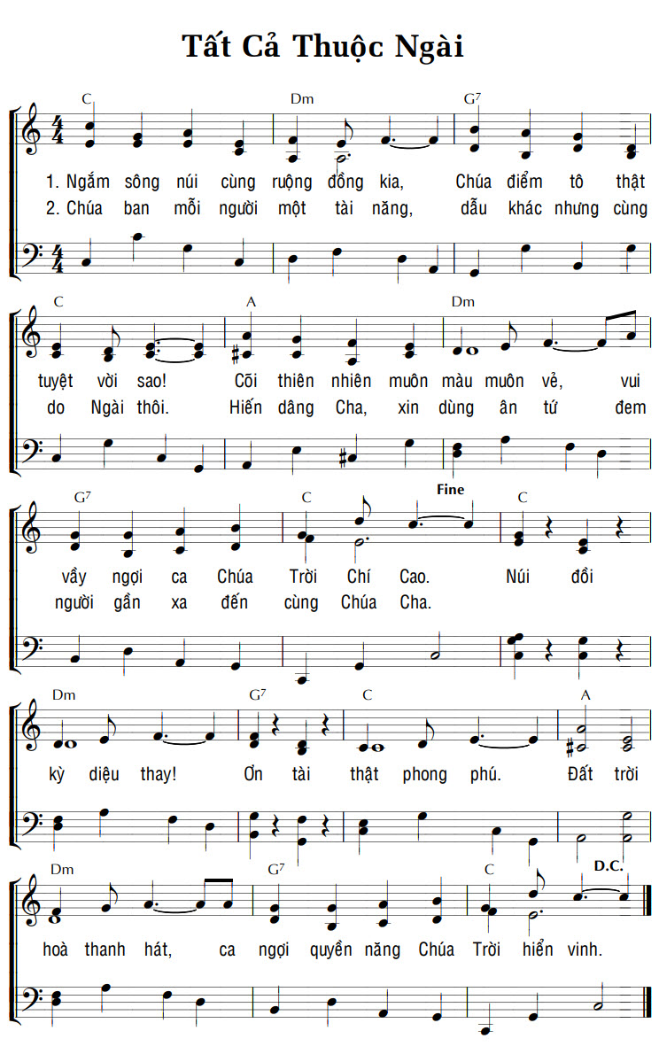 1. Ngắm sông núi cùng ruộng đồng kia, Chúa điểm tô thật tuyệt vời sao! Cõi thiên nhiên muôn màu muôn vẻ, vui vầy ngợi ca Chúa Trời Chí Cao. Núi đồi kỳ diệu thay! Ơn tài thật phong phú. Đất trời hoà thanh hát, ca ngợi quyền năng Chúa Trời hiển vinh. 2. Chúa ban mỗi người một tài năng, dẫu khác nhưng cùng do Ngài thôi. Hiến dâng Cha, xin dùng ân tứ đem người gần xa đến cùng Chúa Cha. Núi đồi kỳ diệu thay! Ơn tài thật phong phú. Đất trời hoà thanh hát, ca ngợi quyền năng Chúa Trời hiển vinh.