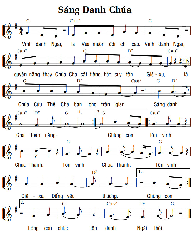 1. Vinh danh Ngài, là Vua muôn đời chí cao. Vinh danh Ngài, quyền năng thay Chúa Cha cất tiếng hát suy tôn Giê-xu, là Chúa Cứu Thế Cha ban cho trần gian. Sáng danh Cha toàn năng. Chúng con tôn vinh Chúa Thánh. Tôn vinh Chúa Thánh. Tôn vinh Giê-xu, Đấng yêu thương. Chúng con lòng con chúc tôn danh Ngài thôi. 2. Sáng danh Cha toàn năng. Chúng con tôn vinh Chúa Thánh. Tôn vinh Chúa Thánh. Tôn vinh Giê-xu, Đấng yêu thương. Lòng con chúc tôn danh Ngài thôi.