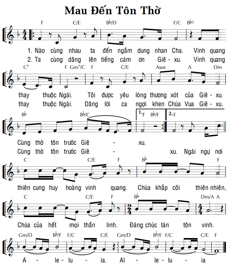1. Nào cùng nhau ta đến ngắm dung nhan Cha. Vinh quang thay thuộc Ngài. Tôi được yêu lòng thương xót của Giê - xu. 2. Ta cùng dâng lên tiếng cám ơn Giê - xu. Vinh quang thay thuộc Ngài. Dâng lời ca ngợi khen Chúa Vua Giê - xu. Điệp khúc: Cùng thờ tôn trước Giê - xu. Ngài ngự nơi thiên cung huy hoàng vinh quang. Chúa khắp cõi thiên nhiên, Chúa của hết mọi thần linh. Đáng chúc tán tôn vinh. A - le - lu - ia. Al - le - lu - ia
