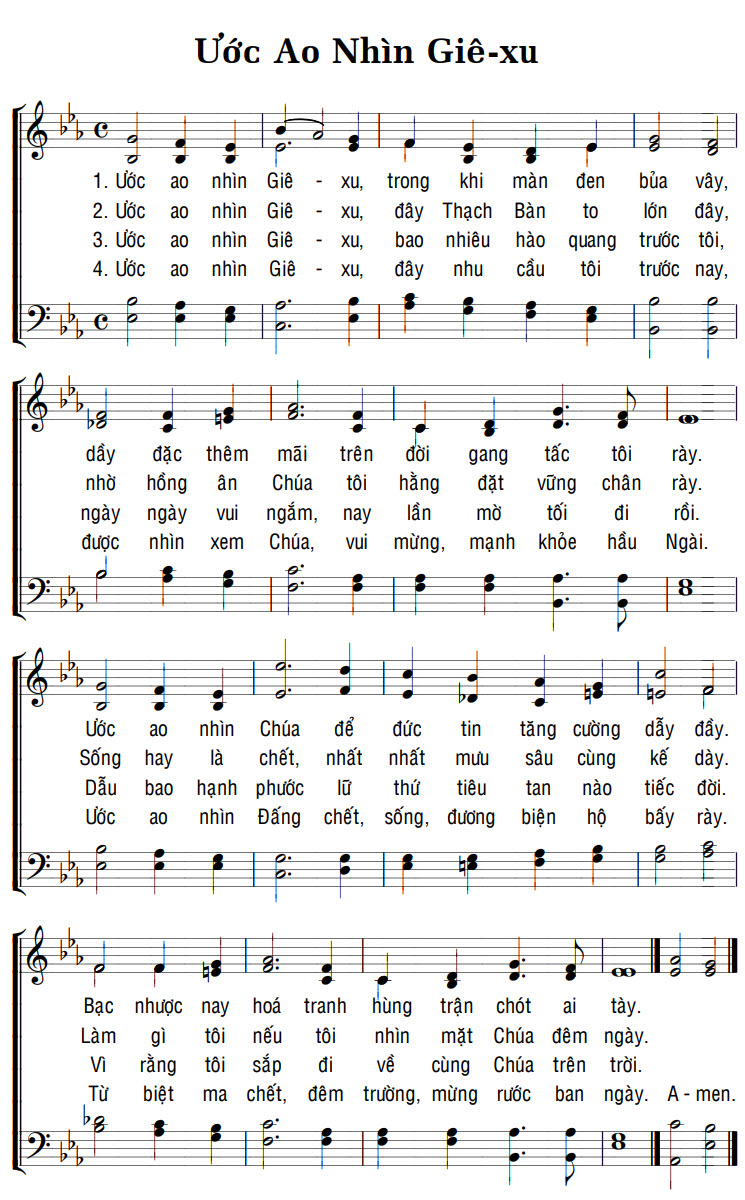 1. Ước ao nhìn Giê-xu, trong khi màn đen bủa vây, dầy đặc thêm mãi trên đời gang tấc tôi rày. Ước ao nhìn Chúa để đức tin tăng cường dẫy đầy. Bạc nhược nay hoá tranh hùng trận chót ai tày. 2. Ước ao nhìn Giê-xu, đây Thạch Bàn to lớn đây, nhờ hồng ân Chúa tôi hằng đặt vững chân rày. Sống hay là chết, nhất nhất mưu sâu cùng kế dày. Làm gì tôi nếu tôi nhìn mặt Chúa đêm ngày. 3. Ước ao nhìn Giê-xu, bao nhiêu hào quang trước tôi, ngày ngày vui ngắm, nay lần mờ tối đi rồi. Dẫu bao hạnh phước lữ thứ tiêu tan nào tiếc đời. Vì rằng tôi sắp đi về cùng Chúa trên trời. 4. Ước ao nhìn Giê-xu, đây nhu cầu tôi trước nay, được nhìn xem Chúa, vui mừng, mạnh khỏe hầu Ngài. Ước ao nhìn Đấng chết, sống, đương biện hộ bấy rày. Từ biệt ma chết, đêm trường, mừng rước ban ngày. A-men.
