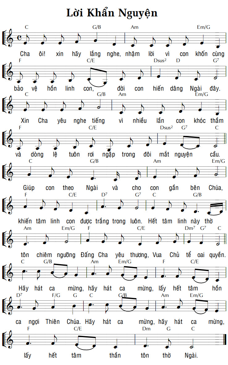1. Cha ơi! xin hãy lắng nghe, nhậm lời vì con khốn cùng bảo vệ hồn linh con, đời con hiến dâng Ngài đây. Xin Cha yêu nghe tiếng vì nhiều lần con khóc thầm và dòng lệ tuôn rơi ngập trong đôi mắt nguyện cầu. Giúp con theo Ngài và cho con gần bên Chúa, khiến tâm linh con được trắng trong luôn. Hết tâm linh này thờ tôn chiêm ngưỡng Đấng Cha yêu thương, Vua Chủ tể oai quyền. Hãy hát ca mừng, hãy hát ca mừng, lấy hết tâm hồn ca ngợi Thiên Chúa. Hãy hát ca mừng, hãy hát ca mừng, lấy hết tâm thần tôn thờ Ngài.