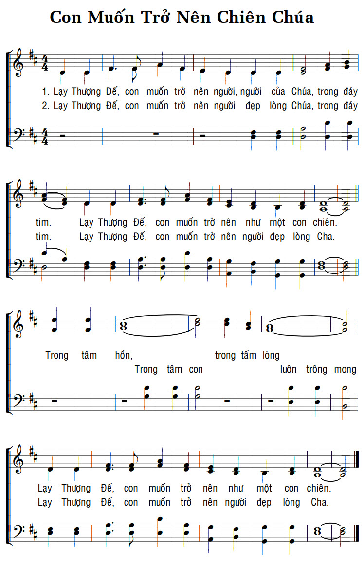 1. Lạy Thượng Đế, con muốn trở nên người, người của Chúa, trong đáy tim. Lạy Thượng Đế, con muốn trở nên như một con chiên. Trong tâm hồn, trong tấm lòng luôn trông mong Lạy Thượng Đế, con muốn trở nên như một con chiên. 2. Lạy Thượng Đế, con muốn trở nên người đẹp lòng Chúa, trong đáy tim. Lạy Thượng Đế, con muốn trở nên người đẹp lòng Cha. Trong tâm con luôn trông mong Lạy Thượng Đế, con muốn trở nên người đẹp lòng Cha.