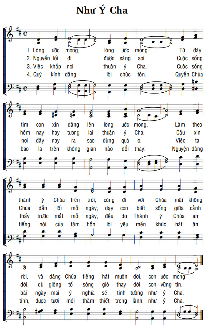 1. Lòng ước mong, lòng ước mong. Từ đáy tim con xin dâng lên lòng ước mong. Làm theo thánh ý Chúa trên trời, cùng đi với Chúa mãi không rời, và dâng Chúa tiếng hát muôn đời, con ước mong. 2. Nguyễn lối đi được sáng soi. Cuộc sống hôm nay hay tương lai thuận ý Cha. Cầu xin Chúa dẫn lối mỗi ngày, dạy con biết sống giữa cảnh đời, dù giông tố sóng gió thay dời con vững tin. 3. Việc khắp nơi thuận ý Cha. Cuộc sống nơi đây nay ra sao đừng quá lo. Việc ta thấy trước mắt mỗi ngày, đều do Thánh ý Chúa an bài, ngày mai ý nghĩa sẽ tinh tường như ý Cha. 4. Quỳ kính dâng lời chúc tôn. Quyền Chúa bao la trên không gian nào đổi thay. Nguyện dâng tiếng nói của tâm hồn, lời yêu mến khúc hát ân tình, được tươi mới thắm thiết trong lành như ý Cha.