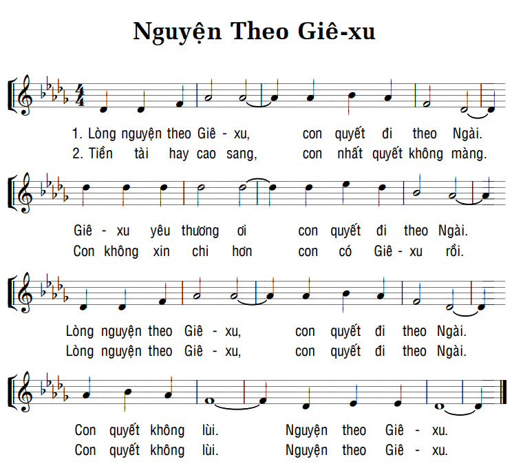 1. Lòng nguyện theo Giê-xu, con quyết đi theo Ngài. Giê-xu yêu thương ơi con quyết đi theo Ngài. Lòng nguyện theo Giê-xu, con quyết đi theo Ngài. Con quyết không lùi. Nguyện theo Giê-xu. 2. Tiền tài hay cao sang, con nhất quyết không màng. Con không xin chi hơn con có Giê-xu rồi. Lòng nguyện theo Giê-xu, con quyết đi theo Ngài. Con quyết không lùi. Nguyện theo Giê-xu.
