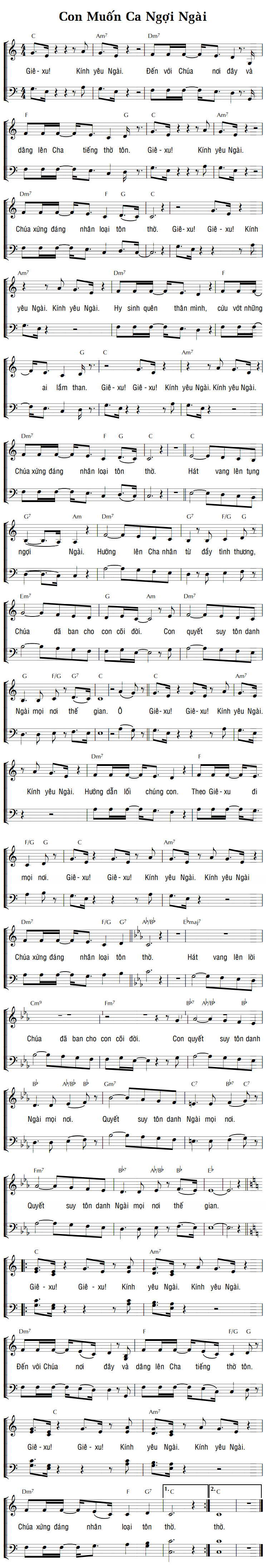 1. Giê-xu! Kính yêu Ngài. Đến với Chúa nơi đây và dâng lên Cha tiếng thờ tôn. Giê-xu! Kính yêu Ngài. Chúa xứng đáng nhân loại tôn thờ. Giê-xu! Giê-xu! Kính yêu Ngài. Kính yêu Ngài. Hy sinh quên thân mình, cứu vớt những ai lầm than. Giê-xu! Giê-xu! Kính yêu Ngài. Kính yêu Ngài. Chúa xứng đáng nhân loại tôn thờ. Hát vang lên tụng ngợi Ngài. Hướng lên Cha nhân từ đầy tình thương, Chúa đã ban cho con cõi đời. Con quyết suy tôn danh Ngài mọi nơi thế gian. Ô Giê-xu! Giê-xu! Kính yêu Ngài. Kính yêu Ngài. Hướng dẫn lối chúng con. Theo Giê-xu đi mọi nơi. Giê-xu! Giê-xu! Kính yêu Ngài. Kính yêu Ngài. Chúa xứng đáng nhân loại tôn thờ. 2. Giê-xu! Giê-xu! Kính yêu Ngài. Kính yêu Ngài. Đến với Chúa nơi đây và dâng lên Cha tiếng thờ tôn. Giê-xu! Giê-xu! Kính yêu Ngài. Kính yêu Ngài. Chúa xứng đáng nhân loại tôn thờ. thờ. Điệp khúc: Hát vang lên lời Chúa đã ban cho con cõi đời. Con quyết suy tôn danh Ngài mọi nơi. Quyết suy tôn danh Ngài mọi nơi. Quyết suy tôn danh Ngài mọi nơi thế gian.