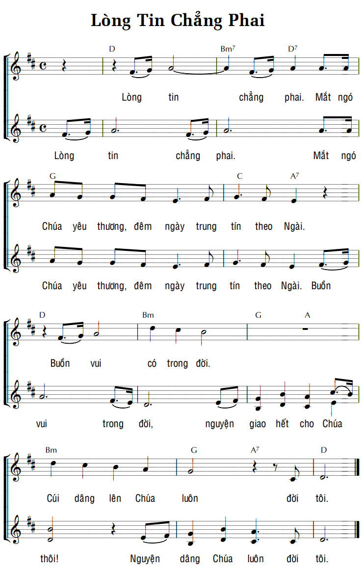 1. Lòng tin chẳng phai. Mắt ngó Chúa yêu thương, đêm ngày trung tín theo Ngài. Buồn vui có trong đời, nguyện giao hết cho Chúa đời tôi. 2. Lòng tin chẳng phai. Mắt ngó Chúa yêu thương, đêm ngày trung tín theo Ngài. Nguyện dâng Chúa luôn đời tôi.