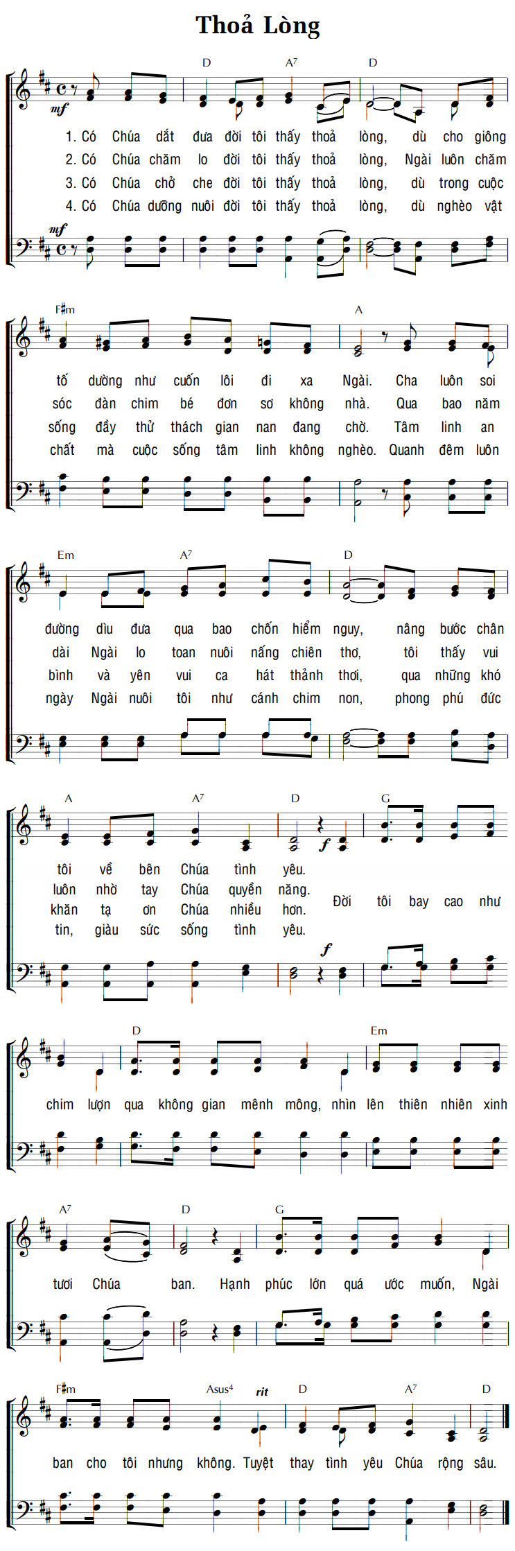 1. Có Chúa dắt đưa đời tôi thấy thoả lòng, dù cho giông tố dường như cuốn lôi đi xa Ngài. Cha luôn soi đường dìu đưa qua bao chốn hiểm nguy, nâng bước chân tôi về bên Chúa tình yêu. Đời tôi bay cao như chim lượn qua không gian mênh mông, nhìn lên thiên nhiên xinh tươi Chúa ban. Hạnh phúc lớn quá ước muốn, Ngài ban cho tôi nhưng không. Tuyệt thay tình yêu Chúa rộng sâu. 2. Có Chúa chăm lo đời tôi thấy thoả lòng, Ngài luôn chăm sóc đàn chim bé đơn sơ không nhà. Qua bao năm dài Ngài lo toan nuôi nấng chiên thơ, tôi thấy vui luôn nhờ tay Chúa quyền năng. Đời tôi bay cao như chim lượn qua không gian mênh mông, nhìn lên thiên nhiên xinh tươi Chúa ban. Hạnh phúc lớn quá ước muốn, Ngài ban cho tôi nhưng không. Tuyệt thay tình yêu Chúa rộng sâu. 3. Có Chúa chở che đời tôi thấy thoả lòng, dù trong cuộc sống đầy thử thách gian nan đang chờ. Tâm linh an bình và yên vui ca hát thảnh thơi, qua những khó khăn tạ ơn Chúa nhiều hơn. Đời tôi bay cao như chim lượn qua không gian mênh mông, nhìn lên thiên nhiên xinh tươi Chúa ban. Hạnh phúc lớn quá ước muốn, Ngài ban cho tôi nhưng không. Tuyệt thay tình yêu Chúa rộng sâu. 4. Có Chúa dưỡng nuôi đời tôi thấy thoả lòng, dù nghèo vật chất mà cuộc sống tâm linh không nghèo. Quanh đêm luôn ngày Ngài nuôi tôi như cánh chim non, phong phú đức tin, giàu sức sống tình yêu. Đời tôi bay cao như chim lượn qua không gian mênh mông, nhìn lên thiên nhiên xinh tươi Chúa ban. Hạnh phúc lớn quá ước muốn, Ngài ban cho tôi nhưng không. Tuyệt thay tình yêu Chúa rộng sâu.