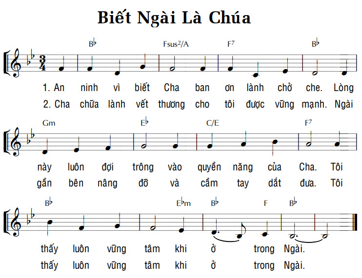 1. An ninh vì biết Cha ban ơn lành chở che. Lòng này luôn đợi trông vào quyền năng của Cha. Tôi thấy luôn vững tâm khi ở trong Ngài. 2. Cha chữa lành vết thương cho tôi được vững mạnh. Ngài gần bên nâng đỡ và cầm tay dắt đưa. Tôi thấy luôn vững tâm khi ở trong Ngài.