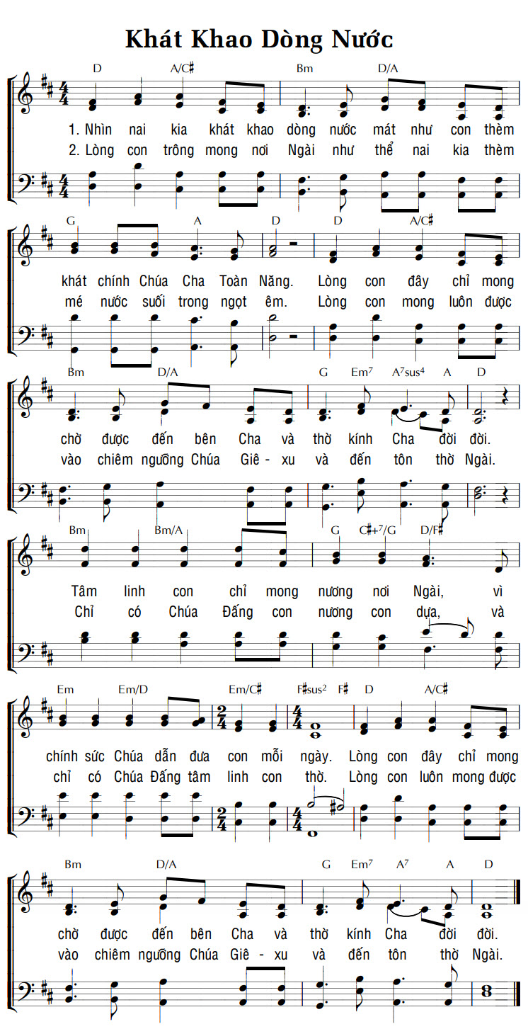 1. Nhìn nai kia khát khao dòng nước mát như con thèm khát chính Chúa Cha Toàn Năng. Lòng con đây chỉ mong chờ được đến bên Cha và thờ kính Cha đời đời. Tâm linh con chỉ mong nương nơi Ngài, vì chính sức Chúa dẫn đưa con mỗi ngày. Lòng con đây chỉ mong chờ được đến bên Cha và thờ kính Cha đời đời. 2. Lòng con trông mong nơi Ngài như thể nai kia thèm mé nước suối trong ngọt êm. Lòng con mong luôn được vào chiêm ngưỡng Chúa Giê-xu và đến tôn thờ Ngài. Chỉ có Chúa Đấng con nương con dựa, và chỉ có Chúa Đấng tâm linh con thờ. Lòng con luôn mong được vào chiêm ngưỡng Chúa Giê-xu và đến tôn thờ Ngài.